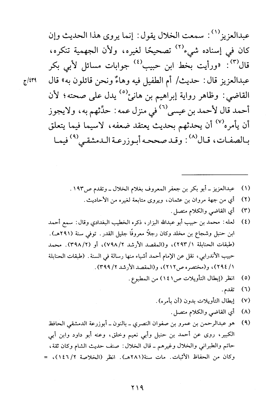 عبد العزيز سمعت الخلال يقول إنما يروى هذا الحديث وإن كان في إسناده شيء تصحيحًا لغيره ولأن الجهمية تنكره قال ورأيت بخط ابن حبيب جوابات مسائل لأبي بكر عبد العزيز قال حديث أم الطفيل فيه وهاءٌ ونحن قائلون به قال القاضي وظاهر رواية إبراهيم بن هانئ يدل على صحته لأن أحمد قال لأحمد بن عيسى في منزل عمه حدِّثهم به ولا يجوز أن يأمره أن يحدثهم بحديث يعتقد ضعفه لاسيما فيما يتعلق بالصفات قال وقد صححه أبوزرعة الدمشقي فيما