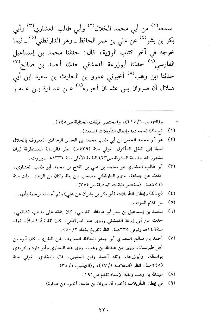 سمعه من أبي محمد الخلال وأبي طالب العشاري وأبي بكر بن بشر عن علي بن عمر الحافظ وهو الدارقطني فيما خرجه في آخر كتاب الرؤية قال حدثنا محمد بن إسماعيل الفارسي حدثنا أبوزرعة الدمشقي حدثنا أحمد بن صالح حدثنا ابن وهب أخبرني عمرو بن الحارث بن سعيد ابن أبي هلال أن مروان بن عثمان أخبره عن عمارة بن عامر
