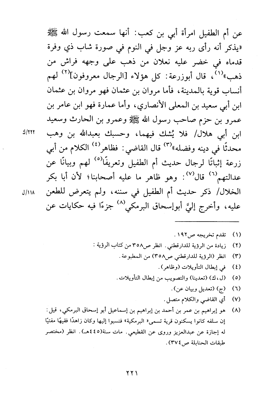 عن أم الطفيل امرأة أبي بن كعب أنها سمعت رسول الله صلى الله عليه وسلم يذكر أنه رأى ربه عز وجل في النوم في صورة شاب ذي وفرة قدماه في خضر عليه نعلان من ذهب على وجهه فراش من ذهب قال أبوزرعة كل هؤلاء الرجال معروفون لهم أنساب قوية بالمدينة فأما مروان فهو مروان بن عثمان ابن أبي سعيد بن المعلى الأنصاري وأما عمارة فهو ابن عامر بن عمرو بن حزم صاحب رسول الله صلى الله عليه وسلم وعمرو بن الحارث وسعيد ابن أبي هلال فلا يُشك فيهما وحسبك بعبد الله بن وهب محدثًّا في دينه وفضله قال القاضي فظاهر الكلام من أبي زرعة إثباتًا لرجال حديث أم الطفيل وتعريفًا لهم وبيانًا عن عدالتهم قال وهو ظاهر ما عليه أصحابنا لأن أبا بكر الخلال ذكر حديث أم الطفيل في سننه ولم يتعرض للطعن عليه وأخرج إليَّ أبوإسحاق البرمكي جزءًا فيه حكايات عن