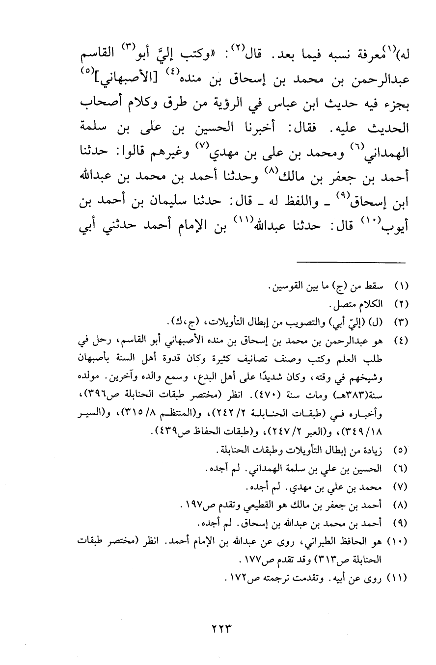 له معرفة نسبه فيما بعد قال وكتب إليَّ أبو القاسم عبد الرحمن بن محمد بن إسحاق بن منده الأصبهاني بجزء فيه حديث لبن عباس في الرؤية من طرق وكلام أصحاب الحديث عليه فقال أخبرنا الحسين بن على بن سلمة الهمداني ومحمد بن على بن معدي وغيرهم قالوا حدثنا أحمد بن جعفر بن مالك وحدثنا احمد بن محمد بن عبد الله ابن إسحاق واللفظ له قال حدثنا سليمان بن أحمد بن أيوب قال حدثنا عبد الله بن الإمام أحمد حدثني أبي