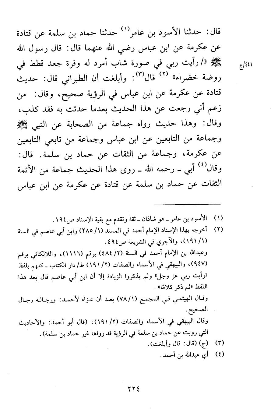 قال حدثنا الأسود بن عامر حدثنا حماد بن سلمة عن قتادة عن عكرمة عن ابن عباس رضي الله عنهما قال قال رسول الله صلى الله عليه وسلم رأيت ربي في صورة شاب أمرد له وفرة جعد قطط في روضة خضراء قال وأبلغت أن الطبراني قال حديث قتادة عن عكرمة عن ابن عباس في الرؤية صحيح وقال من زعم أني رجعت عن هذا الحديث بعدما حدثت به فقد كذب وقال هذا حديث رواه جماعة من الصحابة عن النبي صلى الله عليه وسلم وجماعة من التابعين عن ابن عباس وجماعة من تابعي التابعين عن عكرمة وجماعة من الثقات عن حماد بن سلمة قال وقال أبي رحمه الله روى هذا الحديث جماعة من الأئمة الثقات عن حماد بن سلمة عن قتادة عن عكرمة عن ابن عباس