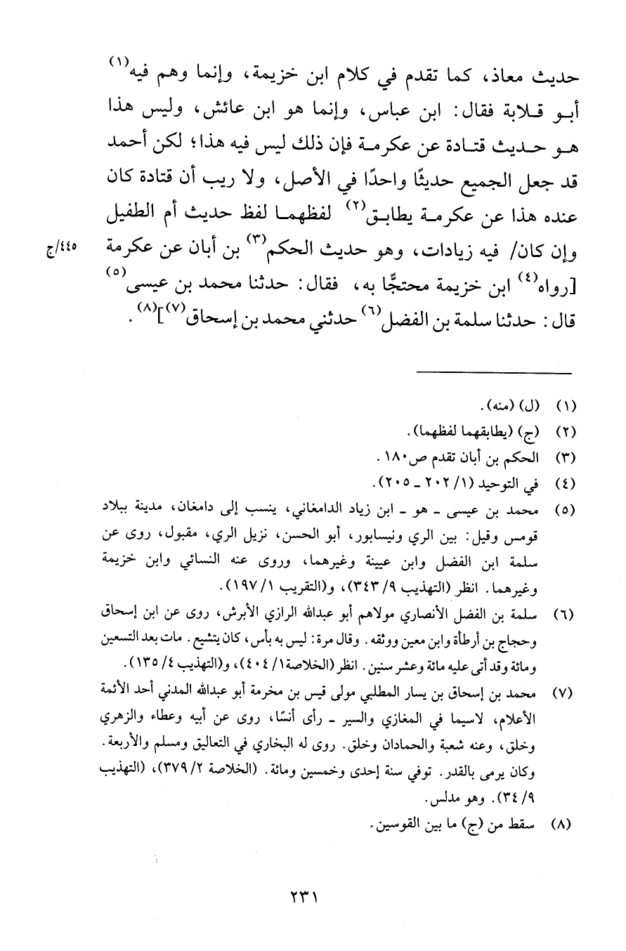 حديث معاذ كما تقدم من كلام ابن خزيمة وإنما وهم فيه أبو قلابة فقال ابن عباس وإنما هو ابن عائش وليس هذا هو حديث قتادة عن عكرمة فإن ذلك ليس فيه هذا لكن أحمد قد جعل الجميع حديثًا واحدًا في الأصل ولا ريب أن قتادة كان عنده هذا عن عكرمة يطابق لفظهما لفظ حديث أم الطفيل وإن كان فيه زيادات وهو حديث الحكم بن أبان عن عكرمة رواه ابن خزيمة محتجًّا به فقال حدثنا محمد بن عيسى قال حدثنا سلمة بن الفضل حدثني محمد بن إسحاق