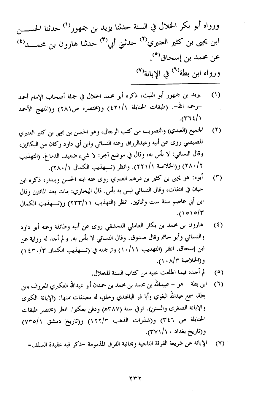 ورواه أبو بكر الخلال في السنة حدثنا يزيد بن جمهور حدثنا الحسن ابن يحيى بن كثير العنبري حدثني أبي حدثنا هارون بن محمد عن محمد بن إسحاق ورواه ابن بطة في الإبانة