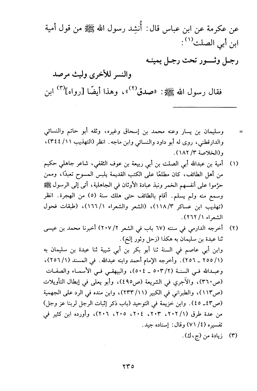 عن عكرمة عن ابن عباس قال أُنشِد رسول الله صلى الله عليه وسلم من قول أمية ابن أبي الصلت رجل وثور تحت رجل يمينه والنسر للأخرى وليث مرصد فقال رسول الله صلى الله عليه وسلم صدق وهذا أيضًا رواه ابن