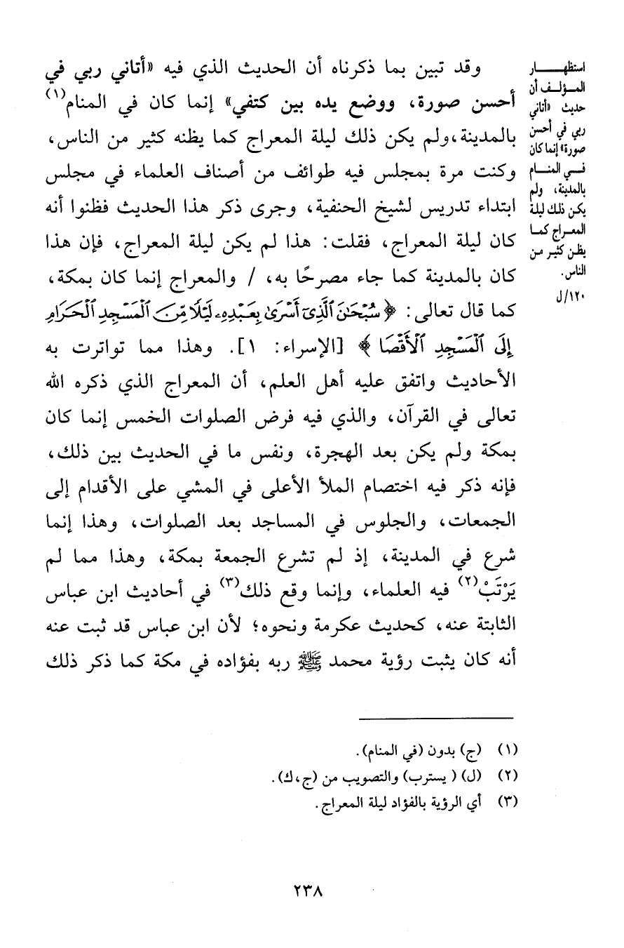 وقد تبين بما ذكرناه أن الحديث الذي فيه أتاني ربي في أحسن صورة ووضع يده بين كتفي إنما كان في المنام بالمدينة ولم يكن ذلك ليلة المعراج كما يظنه كثير من الناس وكنت مرة بمجلس فيه طوائف من أصناف العلماء في مجلس ابتداء تدريس لشيخ الحنفية وجرى ذلك هذا الحديث فظنوا أنه كان ليلة المعراج فقلت هذا لم يكن ليلة المعراج فإن هذا كان بالمدينة كما جاء مصرحًا به والمعراج إنما كان بمكة كما قال تعالى سُبْحَانَ الَّذِي أَسْرَى بِعَبْدِهِ لَيْلًا مِنَ الْمَسْجِدِ الْحَرَامِ إِلَى الْمَسْجِدِ الْأَقْصَى [الإسراء 1] وهذا مما تواترت به الأحاديث واتفق عليه أهل العلم أن المعراج الذي ذكره الله تعالى في القرآن والذي فيه فرض الصلوات الخمس إنما كان بمكة ولم يكن بعد الهجرة ونفس ما في الحديث بين ذلك فإنه ذكر فيه اختصام الملأ الأعلى في المشي على الأقدام إلى الجمعات والجلوس في المساجد بعد الصلوات وهذا إنما شرع في المدينة إذ لم تشرع الجمعة بمكة وهذا مما لم يَرْتَبْ فيه العلماء وإنما وقع ذلك في أحاديث ابن عباس الثابتة عنه كحديث عكرمة ونحوه لأن ابن عباس قد ثبت عنه أنه كان يثبت في رؤية محمد صلى الله عليه وسلم ربع بفؤاده في مكة كما ذكر ذلك