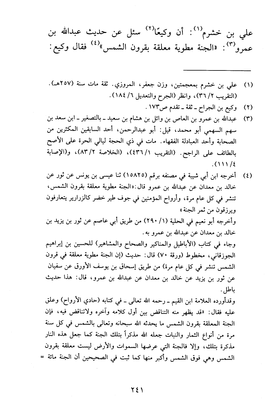 علي بن خشرم أن وكيعًا سئل عن حديث عبد الله بن عمرو الجنة مطوية معلقة بقرون الشمس فقال وكيع