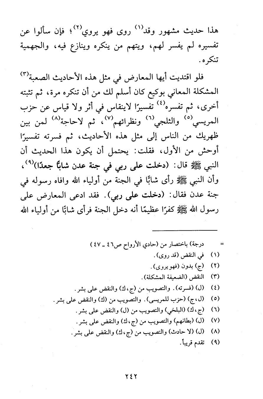 هذا حديث مشهور وقد روى فيه يروي فإن سألوا عن تفسيره لم يفسر لهم ويتهم من ينكره وينازعه فيه والجهمية تنكره فلو اقتديت أيها المعارض في مثل هذه الأحاديث الصعبة المشكلة المعاني بوكيع كان أسلم لك من أن تنكره مرة ثم تثبته أخرى ثم تفسره تفسيرًا لاينقاس في أثر ولا قياس عن حزب المريسي والثلجي ونظرائهم ثم لا حاجة لمن بين ظهريك من الناس إلى مثل هذه الأحاديث ثم فسرته تفسيرًا أوحش من الأول فقلت يحتمل أن يكون هذا الحديث أن النبي صلى الله عليه وسلم قال دخلت على ربي في جنة عدن شابًّا جعدًا وأن النبي صلى الله عليه وسلم رأى شابًّا في الجنة من أولياء الله وافاه رسوله في جنة عدن فقال دخلت على ربي فقد ادعى المعارض على رسول الله صلى الله عليه وسلم كفرًا عظيمًا أنه دخل الجنة فرأى شابًّا من أولياء الله