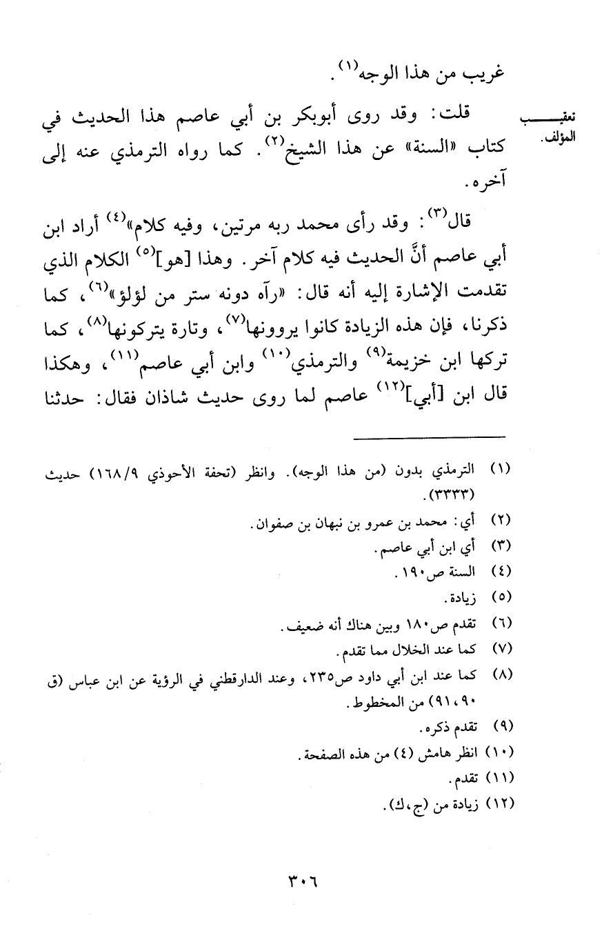 غريب من هذا الوجه قلت وقد روى أبوبكر بن أبي عاصم هذا الحديث في كتاب السنة عن هذا الشيخ كما رواه الترمذي عنه إلى آخره قال وقد رأى محمد ربه مرتين وفيه كلام أراد ابن أبي عاصم أنَّ الحديث فيه كلام آخر وهذا هو الكلام الذي تقدمت الإشارة إليه أنه قال رآه دونه ستر من لؤلؤ كما ذكرنا فإن هذه الزيادة كانوا يروونها وتارة يتركونها كما تركها ابن خزيمة والترمذي وابن أبي عاصم وهكذا قال ابن أبي عاصم لما روى حديث شاذان فقال حدثنا