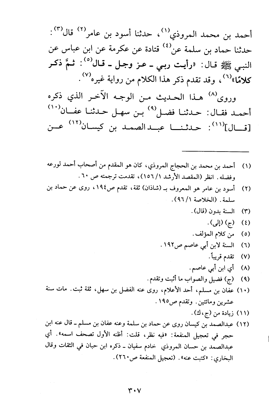 أحمد بن محمد المروذي حدثنا أسود بن عامر قال حدثنا حماد بن سلمة عن قتادة عن عكرمة عن ابن عباس عن النبي صلى الله عليه وسلم قال رأيت ربي عز وجل قال ثمَّ ذكر كلامًا وقد تقدم ذكر هذا الكلام من رواية غيره وروى هذا الحديث من الوجه الآخر الذي ذكره أحمد فقال حدثنا فضل بن سهل حدثنا عفان قال حدثنا عبد الصمد بن كيسان عن