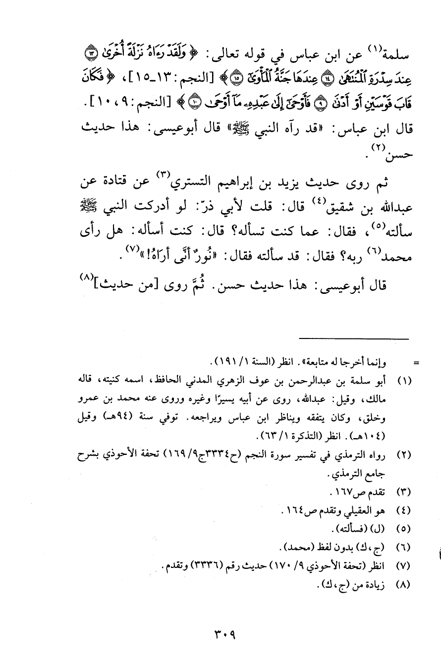 سلمة عن ابن عباس في قوله تعالى وَلَقَدْ رَآهُ نَزْلَةً أُخْرَى (13) عِنْدَ سِدْرَةِ الْمُنْتَهَى (14) عِنْدَهَا جَنَّةُ الْمَأْوَى (15) [النجم 13-15] فَكَانَ قَابَ قَوْسَيْنِ أَوْ أَدْنَى (9) فَأَوْحَى إِلَى عَبْدِهِ مَا أَوْحَى (10) [النجم 9-10] قال ابن عباس قد رآه النبي صلى الله عليه وسلم قال أبوعيسى هذا حديث حسن ثم روى حديث يزيد بن إبراهيم التستري عن قتادة عن عبد الله بن شقيق قال قلت لأبي ذرّ لو أدركت النبي صلى الله عليه وسلم سألته فقال عما كنت تسأله قال كنت أسأله هل رأى محمد ربه فقال قد سألته فقال نُورٌ أنَّى أرَاهُ قال أبو عيسى هذا حديث حسن ثُمَّ روى من حديث