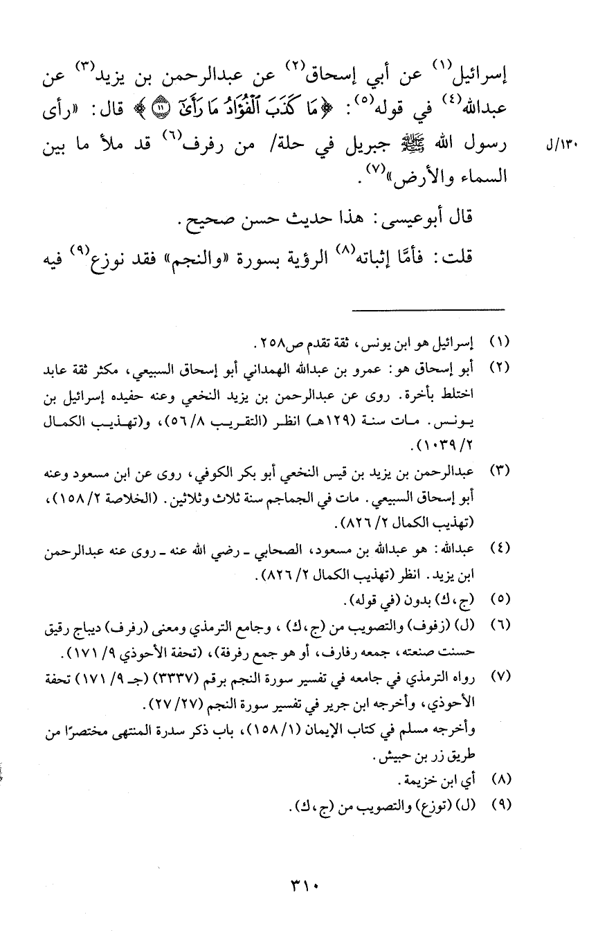 إسرائيل عن أبي إسحاق عن عبد الرحمن بن يزيد عن عبد الله في قوله مَا كَذَبَ الْفُؤَادُ مَا رَأَى (11) قال رأى رسول الله صلى الله عليه وسلم جبريل في حلة من رفرف قد ملأ ما بين السماء والأرض قال أبوعيسى هذا حديث حسن صحيح قلت فأمَّا إثباته الرؤية بسورة والنجم فقد نوزع فيه