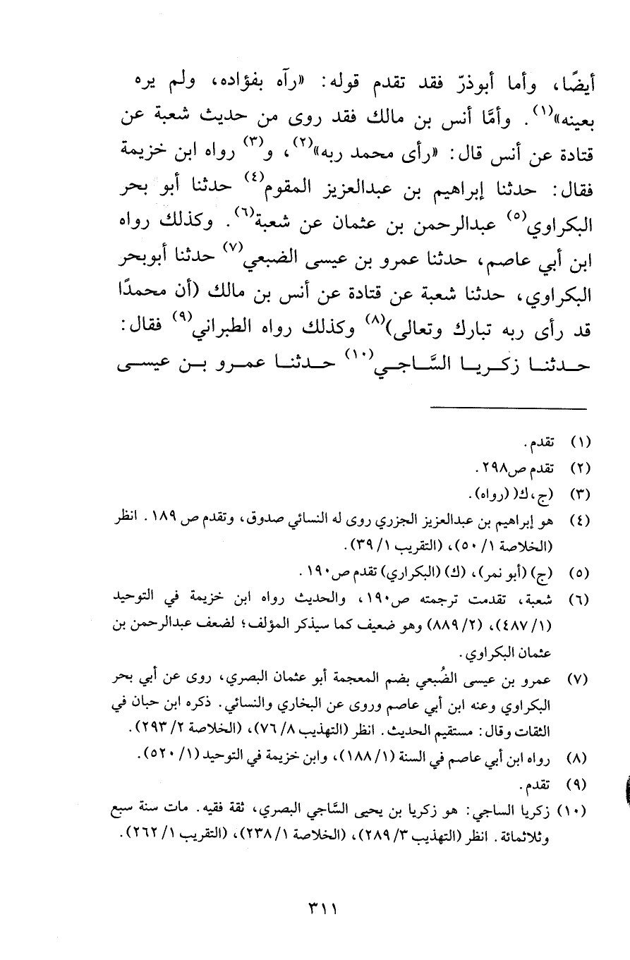 أيضًا وأما أبوذر فقد تقدم قوله رآه بفؤاده ولم يره بعينه وأمَّا أنس بن مالك فقد روى من حديث شعبة عن قتادة عن أنس قال رأى محمد ربه ورواه ابن خزيمة فقال حدثنا إبراهيم بن عبد العزيز المقوم حدثنا أبو بحر البكراوي عبد الرحمن بن عثمان عن شعبة وكذلك رواه ابن أبي عاصم حدثنا عمرو بن عيسى الضبعي حدثنا أبوبحر البكراوي حدثنا شعبة عن قتادة عن أنس بن مالك أن محمدًا قد رأى ربه تبارك وتعالى وكذلك رواه الطبراني فقال حدثنا زكريا السَّاجي حدثنا عمرو بن عيسى