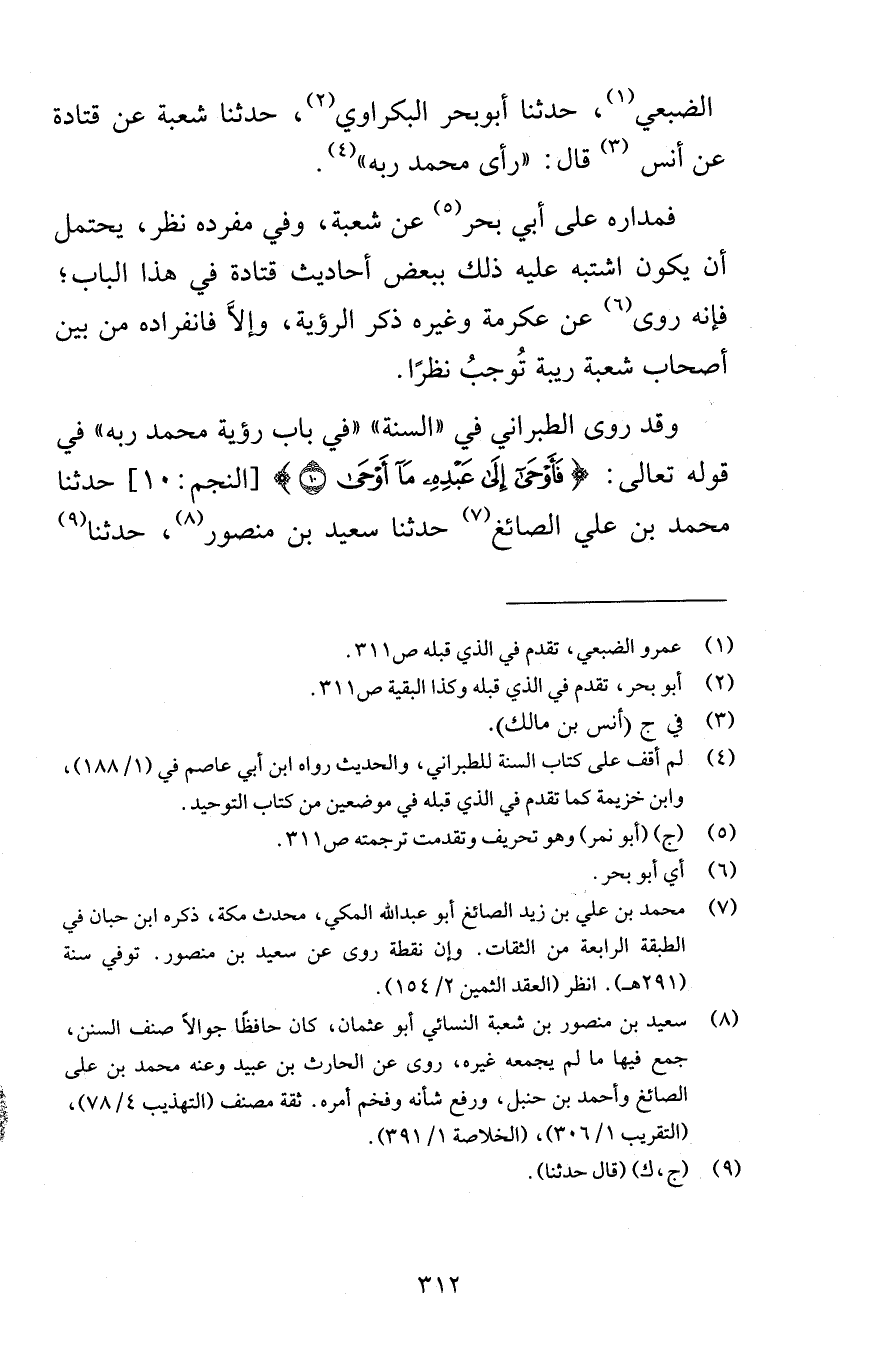 الضبعي حدثنا أبوبحر البكراوي حدثنا شعبة عن قتادة عن أنس قال رأى محمد ربه فمداره على أبي بحر عن شعبة وفي مفرده نظر يحتمل أن يكون اشتبه عليه ذلك ببعض أحاديث قتادة في هذا الباب فإنه روى عن عكرمة وغيره ذكر الرؤية وإلاَّ فانفراده من بين أصحاب شعبة ريبة تُوجبُ نظرًا وقد روى الطبراني في السنة في باب رؤية محمد ربه في قوله تعالى فَأَوْحَى إِلَى عَبْدِهِ مَا أَوْحَى (10) [النجم 10] حدثنا محمد بن علي الصائغ حدثنا سعيد بن منصور حدثنا