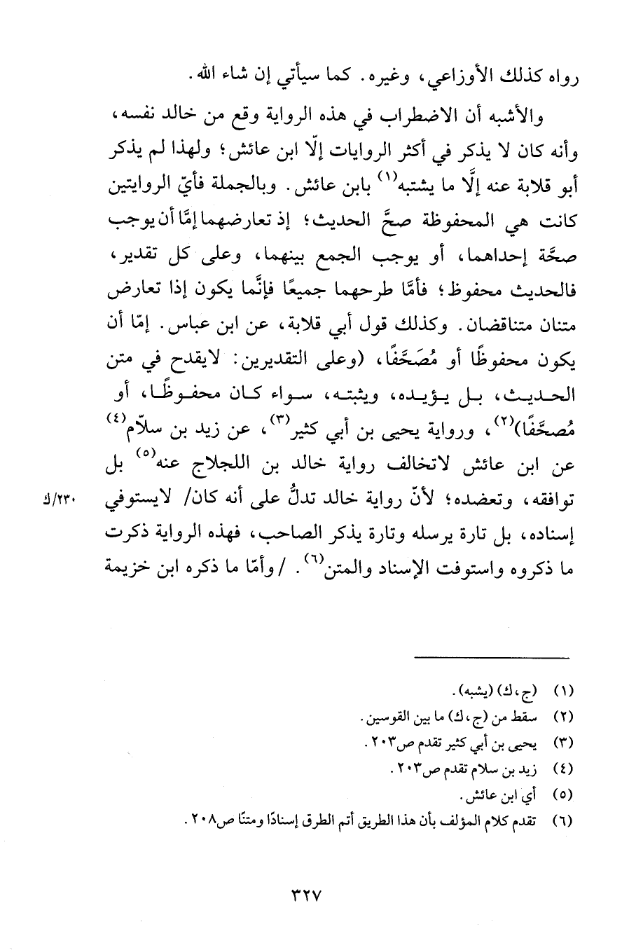 رواه كذلك الأوزاعي وغيره كما سيأتي إن شاء الله والأشبه أن الاضطراب في هذه الرواية وقع من خالد نفسه وأنه كان لا يذكر في أكثر الروايات إلاّ ابن عائش ولهذا لم يذكر أبو قلابة عنه إلاَّ ما يشتبه بابن عائش وبالجملة فأيّ الروايتين كانت هي المحفوظة صحَّ الحديث إذ تعارضهما إمَّا أن يوجب صحَّة إحداهما أو يوجب الجمع بينهما وعلى كل تقدير فالحديث محفوظ فأمَّا طرحهما جميعًا فإنَّما يكون إذا تعارض متنان متناقضان وكذلك قول أبي قلابة عن ابن عباس إمّا أن يكون محفوظًا أو مُصَحَّفًا وعلى التقديرين لا يقدح في متن الحديث بل يؤيده ويثبته سواء كان محفوظًا أو مُصحَّفًا ورواية يحيى بن أبي كثير عن زيد بن سلاّم عن ابن عائش لاتخالف رواية خالد بن اللجلاج عنه بل توافقه وتعضده لأنّ رواية خالد تدلُّ على أنه كان لا يستوفي إسناده بل تارة يرسله وتارة يذكر الصاحب فهذه الرواية ذكرت ما ذكروه واستوفت الإسناد والمتن وأمّا ما ذكره ابن خزيمة