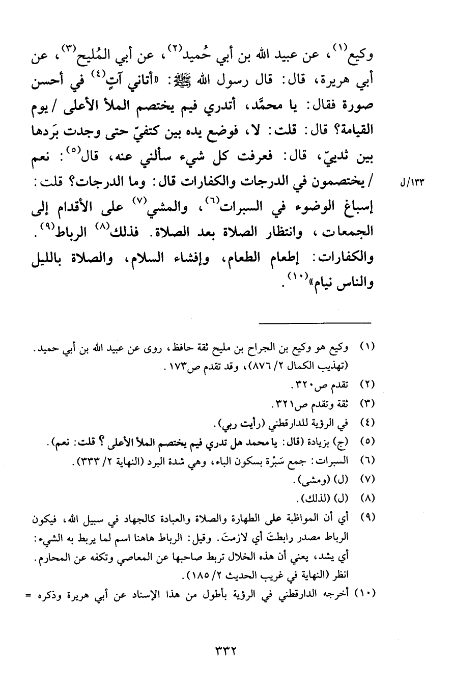 وكيع عن عبيد الله بن أبي حُميد عن أبي المُليح عن أبي هريرة قال قال رسول الله صلى الله عليه وسلم أتاني آتٍ في أحسن صورة فقال يا محمَّد أتدري فيما يختصم الملأ الأعلى يوم القيامة قلت لا فوضع يده بين كتفيّ حتى وجدت بَردها بين ثدييّ قال فعرفت كل شيء سألني عنه قال نعم يختصمون في الدرجات والكفارات قال وما الدرجات قلت إسباغ الوضوء في السبرات والمشي على الأقدام إلى الجمعات وانتظار الصلاة بعد الصلاة فذلك الرباط والكفارات إطعام الطعام وإفشاء السلام والصلاة بالليل والناس نيام