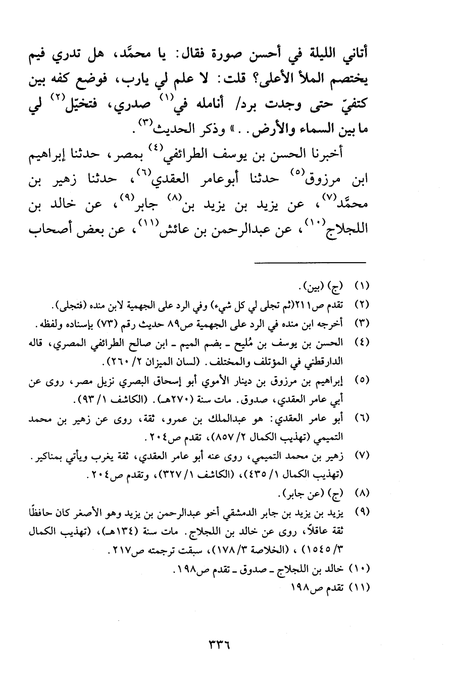 أتاني الليلة في أحسن صورة فقال يا محمَّد هل تدري فيم يختصم الملأ الأعلى قلت لا علم لي يارب فوضع كفه بين كتفيّ حتى وجدت برد أنامله في صدري فتخيّل لي ما بين السماء والأرض وذكر الحديث أخبرنا الحسن بن يوسف الطرائفي بمصر حدثنا إبراهيم ابن مرزوق حدثنا أبوعامر العقدي حدثنا زهير بن محمَّد عن يزيد بن يزيد بن جابر عن خالد بن اللجلاج عن عبد الرحمن بن عائش عن بعض أصحاب