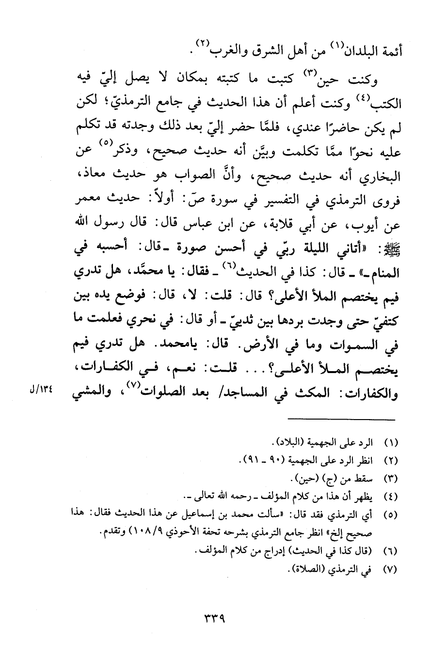 أئمة البلدان من أهل الشرق والغرب وكنت حين كتبت ما كتبته بمكان لا يصل إليّ فيه الكتب وكنت أعلم أن هذا الحديث في جامع الترمذيّ لكن لم يكن حاضرًا عندي فلمَّا حضر إليّ بعد ذلك وجدته قد تكلم عليه نحوًا ممَّا تكلمت وبيَّن أنه حديث صحيح وذكر عن البخاري أنه حديث صحيح وأنَّ الصواب هو حديث معاذ فروى الترمذي في التفسير في سورة ص أولاً حديث معمر عن أيوب عن أبي قلابة عن ابن عباس قال رسول الله صلى الله عليه وسلم أتاني الليلة ربّي في أحسن صورة قال أحسبه في المنام قال كذا في الحديث فقال يا محمَّد هل تدري فيم يختصم الملأ الأعلى قال قلت لا قال فوضع يده بين كتفيّ حتى وجدت بردها بين ثدييّ أو قال في نحري فعلمت ما في السموات وما في الأرض قال يامحمد هل تدري فيم يختصم الملأ الأعلى قلت نعم في الكفارات والكفارات المكث في المساجد بعد الصلوات والمشي