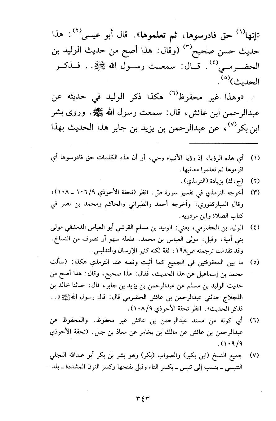 إنها حق فادرسوها ثم تعلموها قال أبو عيسى هذا حديث حسن صحيح وقال هذا أصح من حديث الوليد بن الحضرمي قال سمعت رسول الله صلى الله عليه وسلم فذكر الحديث وهذا غير محفوظ هكذا ذكر الوليد في حديثه عن عبد الرحمن ابن عائش قال سمعت رسول الله صلى الله عليه وسلم وروى بشر ابن بكر عن عبد الرحمن بن يزيد بن جابر هذا الحديث بهذا