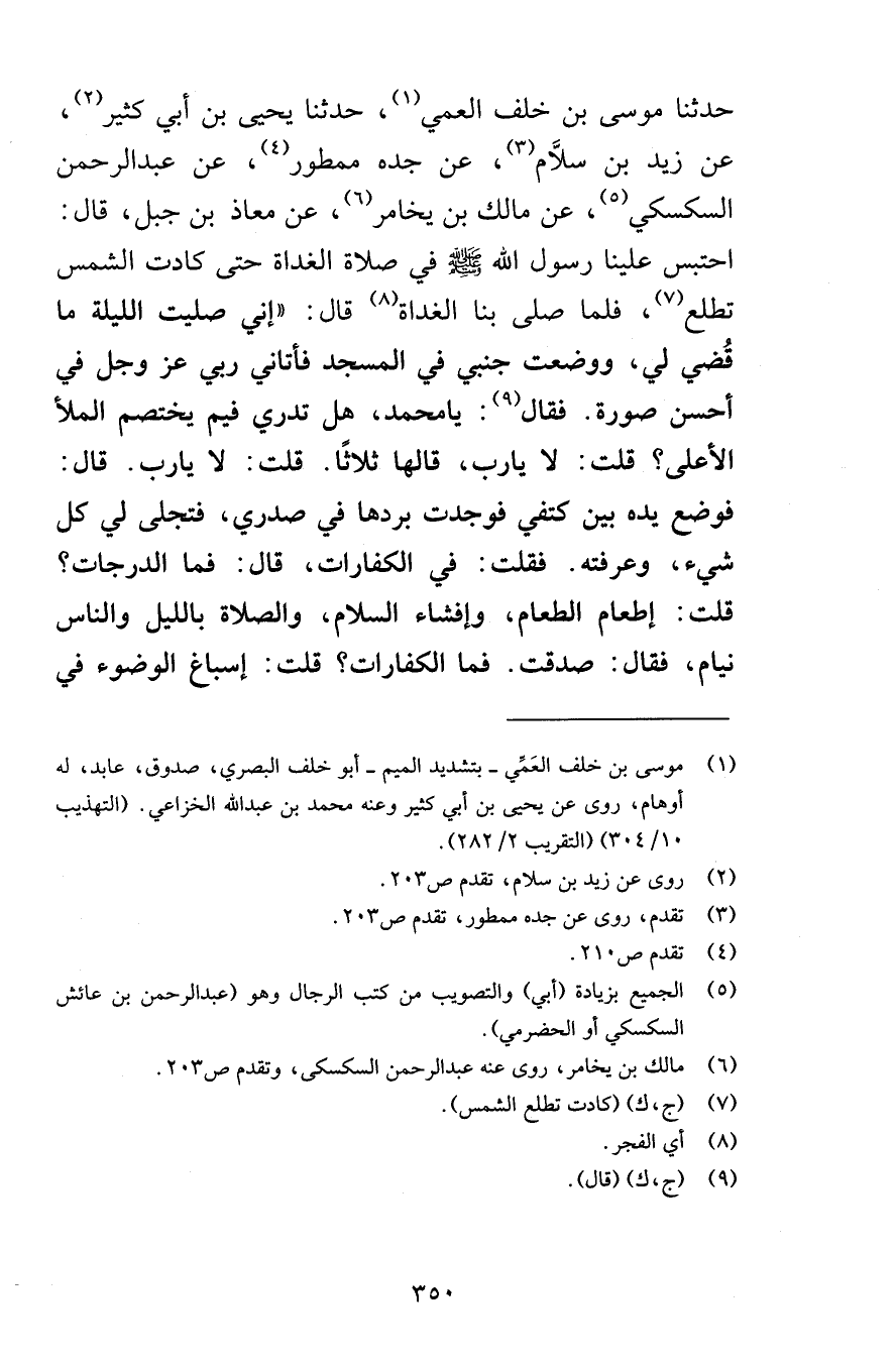 حدثنا موسى بن خلف العمي حدثنا يحيى بن أبي كثير عن زيد بن سلاَّم عن جده ممطور عن عبد الرحمن السكسكي عن مالك بن يخامر عن معاذ بن جبل قال احتبس علينا رسول الله صلى الله عليه وسلم في صلاة الغداة حتى كادت الشمس تطلع فلما صلى بنا الغداة قال إني صليت الليلة ما قُضي لي ووضعت جنبي في المسجد فأتاني ربي عز وجل في أحسن صورة فقال يامحمد هل تدري فيم يختصم الملأ الأعلى قلت لا يارب قالها ثلاثًا قلت لا يارب قال فوضع يده بين كتفي فوجدت بردها في صدري فتجلى لي كل شيء وعرفته فقلت في الكفارات قال فما الدرجات قلت إطعام الطعام وإفشاء السلام والصلاة بالليل والناس نيام فقال صدقت فما الكفارات قلت إسباغ الوضوء في