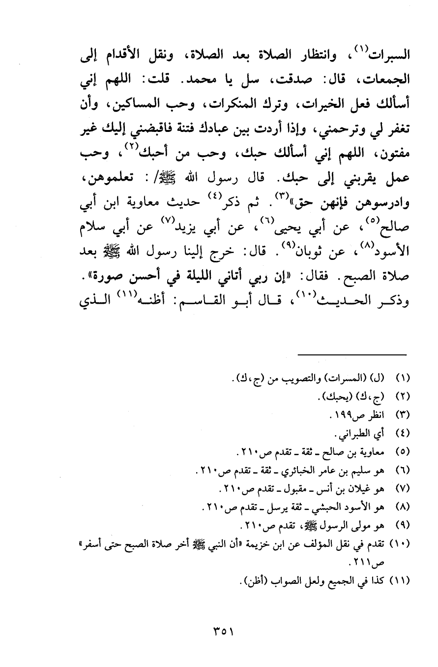السبرات وانتظار الصلاة بعد الصلاة ونقل الأقدام إلى الجمعات قال صدقت سل يا محمد قلت اللهم إني أسألك فعل الخيرات وترك المنكرات وحب المساكين وأن تغفر لي وترحمني وإذا أردت بين عبادك فتنة فاقبضني إليك غير مفتون اللهم إني أسألك حبك وحب من أحبك وحب عمل يقربني إلى حبك قال رسول الله صلى الله عليه وسلم تعلموهن وادرسوهن فإنهن حق ثم ذكر حديث معاوية ابن أبي صالح عن أبي يحيى عن أبي يزيد عن أبي سلام الأسود عن ثوبان قال خرج إلينا رسول الله صلى الله عليه وسلم عد صلاة الصبح فقال إن ربي أتاني الليلة في أحسن صورة وذكر الحديث قال أبو القاسم أظنه الذي