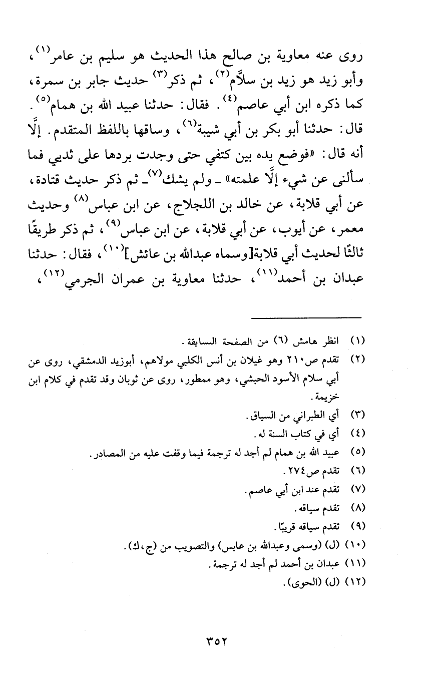 روى عنه معاوية بن صالح هذا الحديث هو سليم بن عامر وأبو زيد هو زيد بن سلاَّم ثم ذكر حديث جابر بن سمرة كما ذكره ابن أبي عاصم فقال حدثنا عبيد الله بن همام قال حدثنا أبو بكر بن أبي شيبة وساقها باللفظ المتقدم إلاَّ أنه قال فوضع يده بين كتفي حتى وجدت بردها على ثديي فما سألني عن شيء إلاَّ علمته ولم يشك ثم ذكر حديث قتادة عن أبي قلابة عن خالد بن اللجلاج عن ابن عباس وحديث معمر عن أيوب عن أبي قلابة عن ابن عباس ثم ذكر طريقًا ثالثًا لحديث أبي قلابة وسماه عبد الله بن عائش فقال حدثنا عبدان بن أحمد حدثنا معاوية بن عمران الجرمي