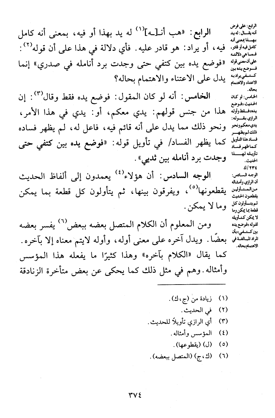 الوجه السادس أن هؤلاء يعمدون إلى ألفاظ الحديث يقطعونها ويفرقون بينها ثم يتأولون كل قطعة بما يمكن وما لا يكمن.