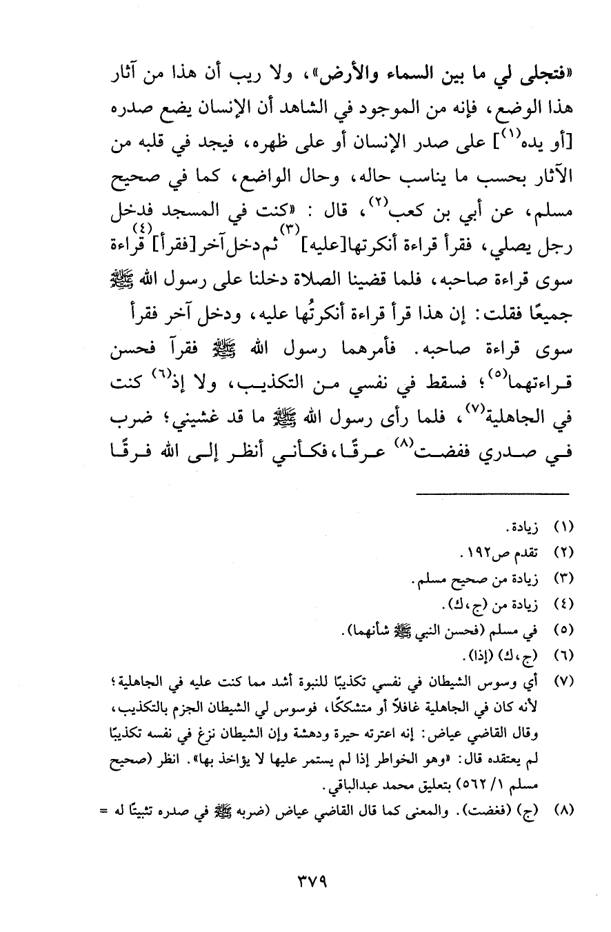 فتجلى لي ما بين السماء والأرض ولا ريب أن هذا من آثار هذا الوضع فإنه من الموجود في الشاهد أن الإنسان يضع صدره أو يده على صدر الإنسان أو على ظهره فيجد في قلبه من الآثار بحسب ما يناسب حاله وحال الواضع كما في صحيح مسلم عن أبي بن كعب قال كنت في المسجد فدخل رجل يصلي فقرأ قراءة أنكرتها عليه ثم دخل آخر فقرأ قراءة سوى قراءة صاحبه فلما قضينا الصلاة دخلنا على رسول الله صلى الله عليه وسلم جميعًا فقلت إن هذا قرأ قراءة أنكرتُها عليه ودخل آخر فقرأ سوى قراءة صاحبه فأمرهما رسول الله صلى الله عليه وسلم فقرآ فحسن قراءتهما فسقط في نفسي من التكذيب ولا إذ كنت في الجاهلية فلما رأى رسول الله صلى الله عليه وسلم ما قد غشيني ضرب في صدري ففضت عرقًا فكأني أنظر إلى الله فرقًا