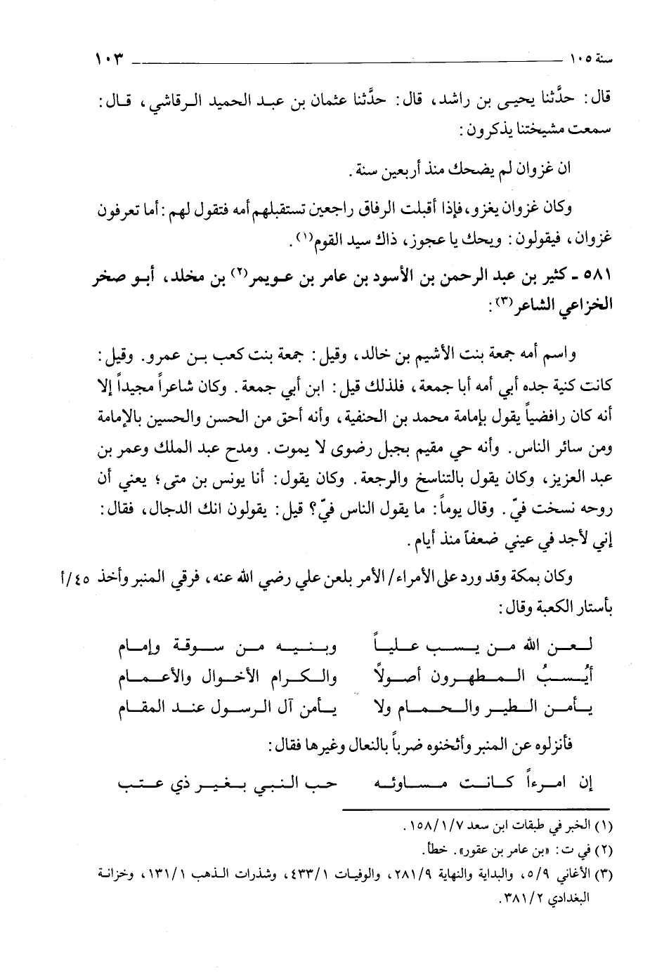 581- كثير بن عبد الرحمن بن الأسود بن عامر بن عويمر [2] بن مخلد، أبو صخر الخزاعي الشاعر [3] :