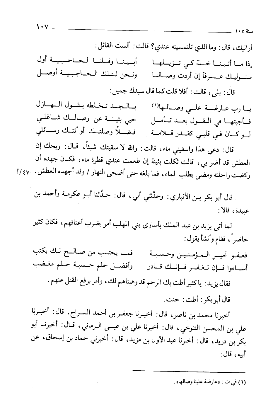 قال: دعي هذا واسقيني ماء، قالت: والله لا سقيتك شيئا، قال: ويحك إن العطش قد أضر بي، قالت ثكلت بثينة إن طعمت عندي قطرة ماء، فكان جهده أن ركضت راحلته ومضى يطلب الماء، فما بلغه حتى أضحى النهار وقد أجهده العطش.