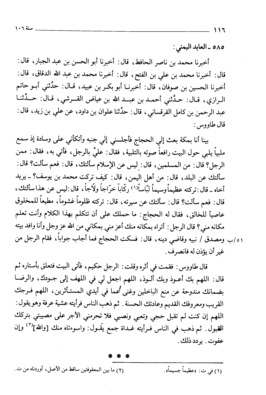 اللَّهمّ إن كنت لم تقبل حجي وتعبي ونصبي فلا تحرمني الأجر على مصيبتي بتركك القبول. ثم ذهب في الناس فرأيته غداة جمع يقول: وا سوءتاه منك [والله] [2] وإن عفوت. يردد ذلك.