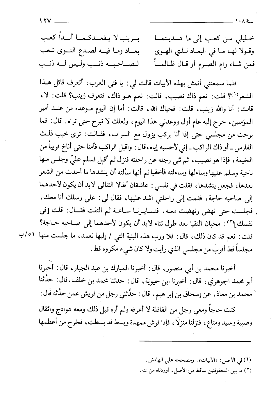 فلما سمعتني أتمثل بهذه الأبيات قالت لي: يا فتى العرب، أتعرف قائل هذا الشعر [1] ؟ قلت: نعم ذاك نصيب، قالت: نعم هو ذاك، فتعرف زينب؟ قلت: لا، قالت: أنا والله زينب، قلت: فحياك الله، قالت: أما إن اليوم موعده من عند أمير المؤمنين، خرج إليه عام أول ووعدني هذا اليوم، ولعلك لا تبرح حتى تراه. قال: فما برحت من مجلسي حتى إذا أنا بركب يزول مع السراب، فقالت: ترى خبب ذلك الفارس- أو ذاك الراكب- إني لأحسبه إياه، قال: وأقبل الراكب فأمنا حتى أناخ قريبا من الخيمة، فإذا هو نصيب، ثم ثنى رجله عن راحلته فنزل ثم أقبل فسلم علي وجلس منها ناحية وسلم عليها وساءلها وساءلته فأخفيا ثم أنها سألته أن ينشدها ما أحدث من الشعر بعدها، فجعل ينشدها، فقلت في نفسي: عاشقان أطالا التنائي لا بد أن يكون لأحدهما إلى صاحبه حاجة، فقمت إلى راحلتي أشد عليها، فقال لي: على رسلك أنا معك، فجلست حتى نهض ونهضت معه، فتسايرنا ساعة ثم التفت فقال: قلت [في نفسك] [2] : محبان التقيا بعد طول تناء لا بد أن يكون لأحدهما إلى صاحبه حاجة؟