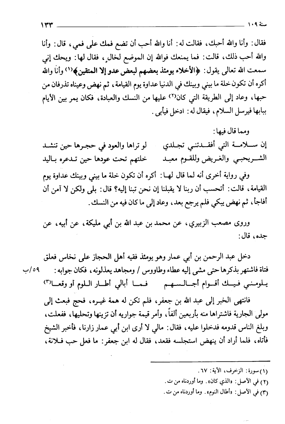 فقال: وأنا والله أحبك، فقالت له: أنا والله أحب أن تضع فمك على فمي، قال: وأنا والله أحب ذلك، قالت: فما يمنعك فو الله إن الموضع لخال، فقال لها: ويحك إني سمعت الله تعالى يقول: (الْأَخِلَّاءُ يَوْمَئِذٍ بَعْضُهُمْ لِبَعْضٍ عَدُوٌّ إِلَّا الْمُتَّقِينَ) 43: 67 [1] وأنا والله أكره أن تكون خلة ما بيني وبينك في الدنيا عداوة يوم القيامة، ثم نهض وعيناه تذرفان من حبها، وعاد إلى الطريقة التي كان [2] عليها من النسك والعبادة، فكان يمر بين الأيام ببابها فيرسل السلام، فيقال له: ادخل فيأبى.