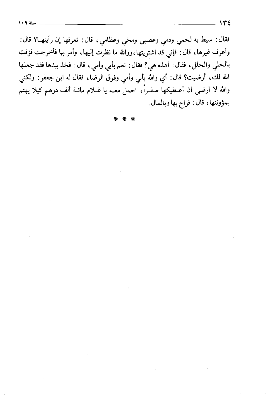 وأعرف غيرها، قال: فإنّي قد اشتريتها، وو الله ما نظرت إليها، وأمر بها فأخرجت فزفت بالحلي والحلل، فقال: أهذه هي؟ فقال: نعم بأبي وأمي، قال: فخذ بيدها فقد جعلها الله لك، أرضيت؟ قال: أي والله بأبي وأمي وفوق الرضا، فقال له ابن جعفر: ولكني والله لا أرضى أن أعطيكها صفرا، احمل معه يا غلام مائة ألف درهم كيلا يهتم بمئونتها، قال: فراح بها وبالمال.