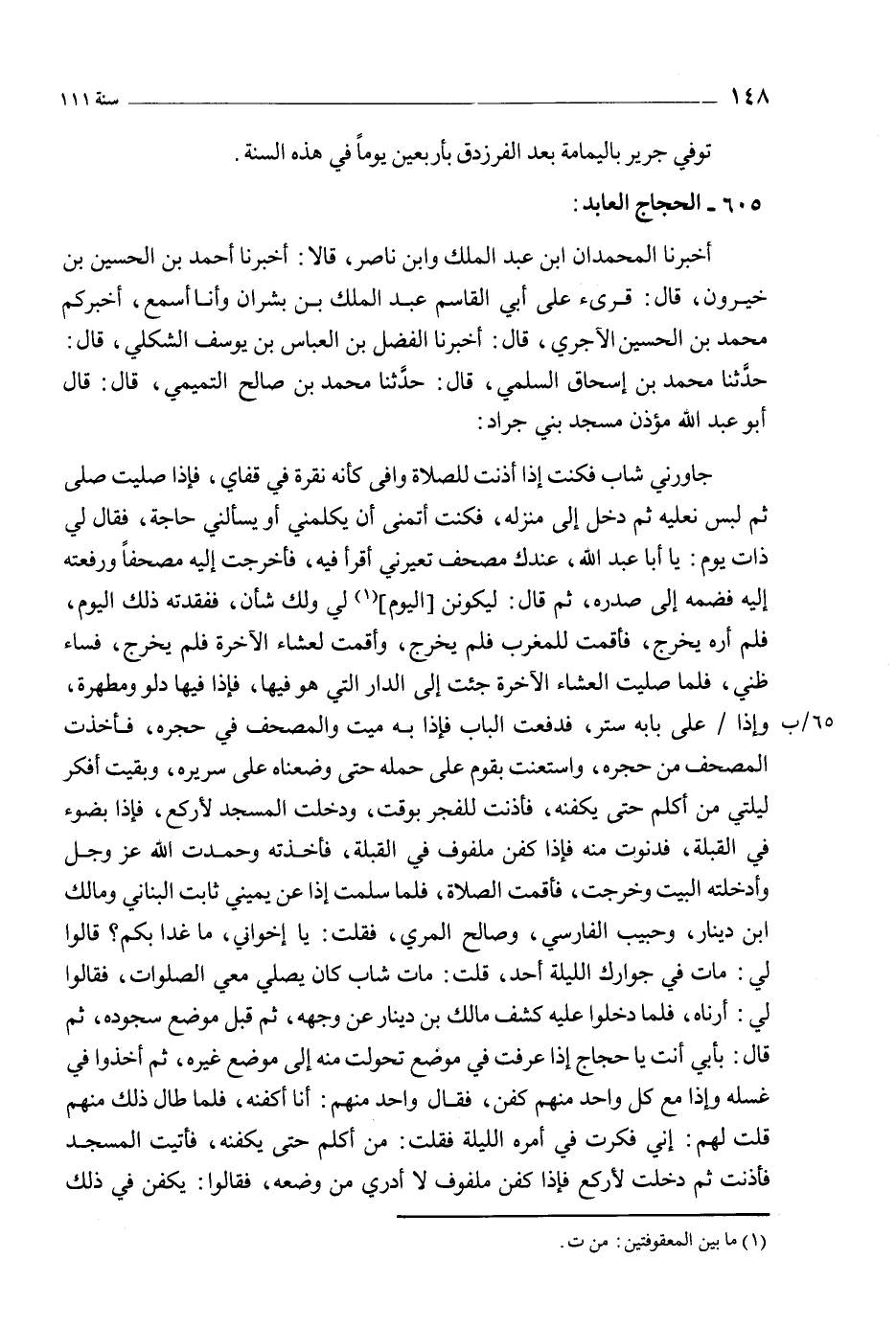 جاورني شاب فكنت إذا أذنت للصلاة وافى كأنه نقرة في قفاي، فإذا صليت صلى ثم لبس نعليه ثم دخل إلى منزله، فكنت أتمنى أن يكلمني أو يسألني حاجة، فقال لي ذات يوم: يا أبا عبد الله، عندك مصحف تعيرني أقرأ فيه، فأخرجت إليه مصحفا ورفعته إليه فضمه إلى صدره، ثم قال: ليكونن [اليوم] [1] لي ولك شأن، ففقدته ذلك اليوم، فلم أره يخرج، فأقمت للمغرب فلم يخرج، وأقمت لعشاء الآخرة فلم يخرج، فساء ظني، فلما صليت العشاء الآخرة جئت إلى الدار التي هو فيها، فإذا فيها دلو ومطهرة، وإذا على بابه ستر، فدفعت الباب فإذا به ميت والمصحف في حجره، فأخذت المصحف من حجره، واستعنت بقوم على حمله حتى وضعناه على سريره، وبقيت أفكر ليلتي من أكلم حتى يكفنه، فأذنت للفجر بوقت، ودخلت المسجد لأركع، فإذا بضوء في القبلة، فدنوت منه فإذا كفن ملفوف في القبلة، فأخذته وحمدت الله عز وجل وأدخلته البيت وخرجت، فأقمت الصلاة، فلما سلمت إذا عن يميني ثابت البناني ومالك ابن دينار، وحبيب الفارسي، وصالح المري، فقلت: يا إخواني، ما غدا بكم؟ قالوا لي: مات في جوارك الليلة أحد، قلت: مات شاب كان يصلي معي الصلوات، فقالوا لي: أرناه، فلما دخلوا عليه كشف مالك بن دينار عن وجهه، ثم قبل موضع سجوده، ثم قال: بأبي أنت يا حجاج إذا عرفت في موضع تحولت منه إلى موضع غيره، ثم أخذوا في غسله وإذا مع كل واحد منهم كفن، فقال واحد منهم: أنا أكفنه، فلما طال ذلك منهم قلت لهم: إني فكرت في أمره الليلة فقلت: من أكلم حتى يكفنه، فأتيت المسجد فأذنت ثم دخلت لأركع فإذا كفن ملفوف لا أدري من وضعه، فقالوا: يكفن في ذلك