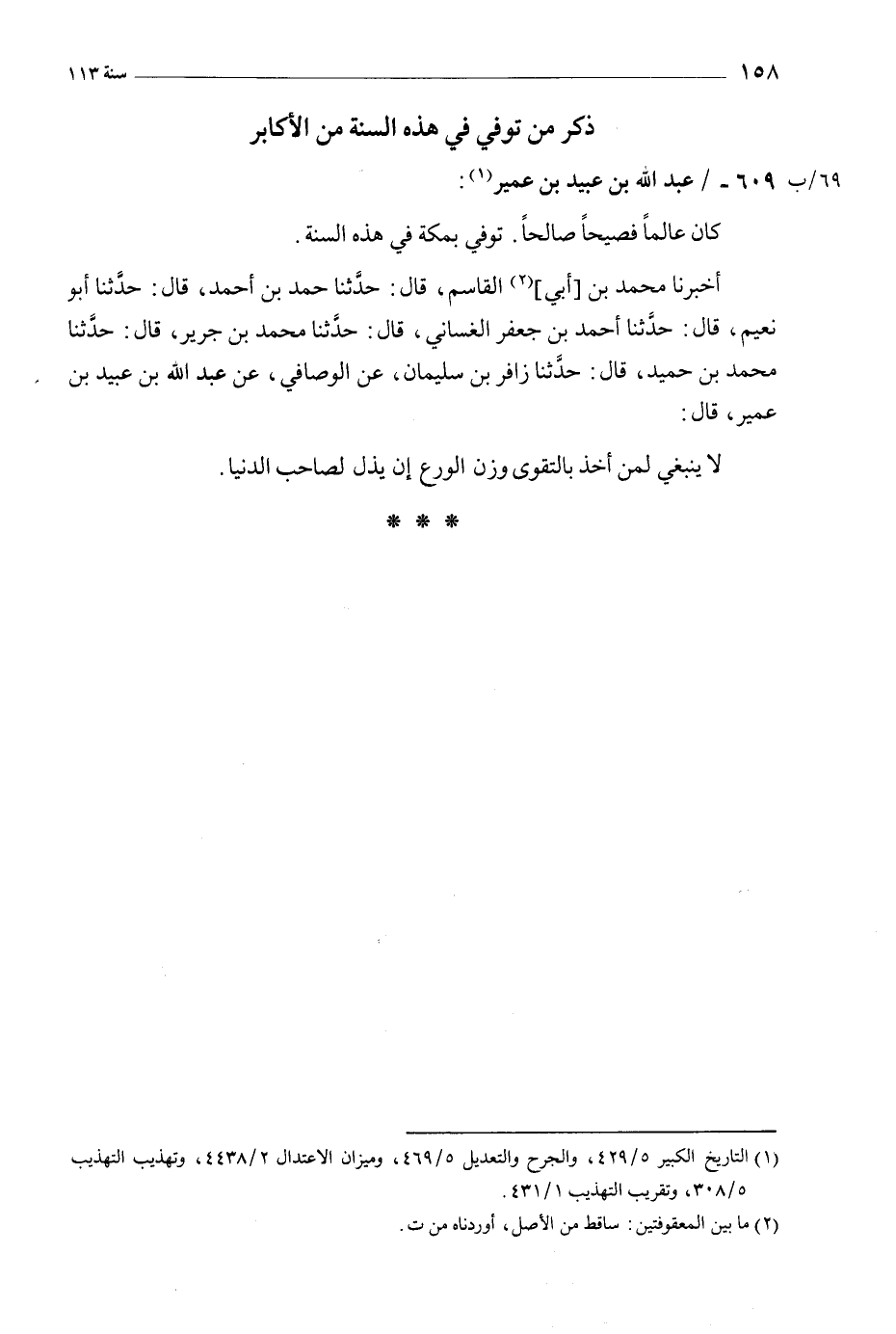 أخبرنا محمد بن [أبي] [2] القاسم، قَالَ: حَدَّثَنَا حمد بْن أَحْمَد، قَالَ: حدثنا أبو نعيم، قال: حدثنا أحمد بن جعفر الغساني، قال: حدثنا محمد بن جرير، قَالَ: حَدَّثَنَا مُحَمَّد بْن حميد، قَالَ: حَدَّثَنَا زافر بن سليمان، عن الوصافي، عن عبد الله بن عبيد بن عمير، قال: