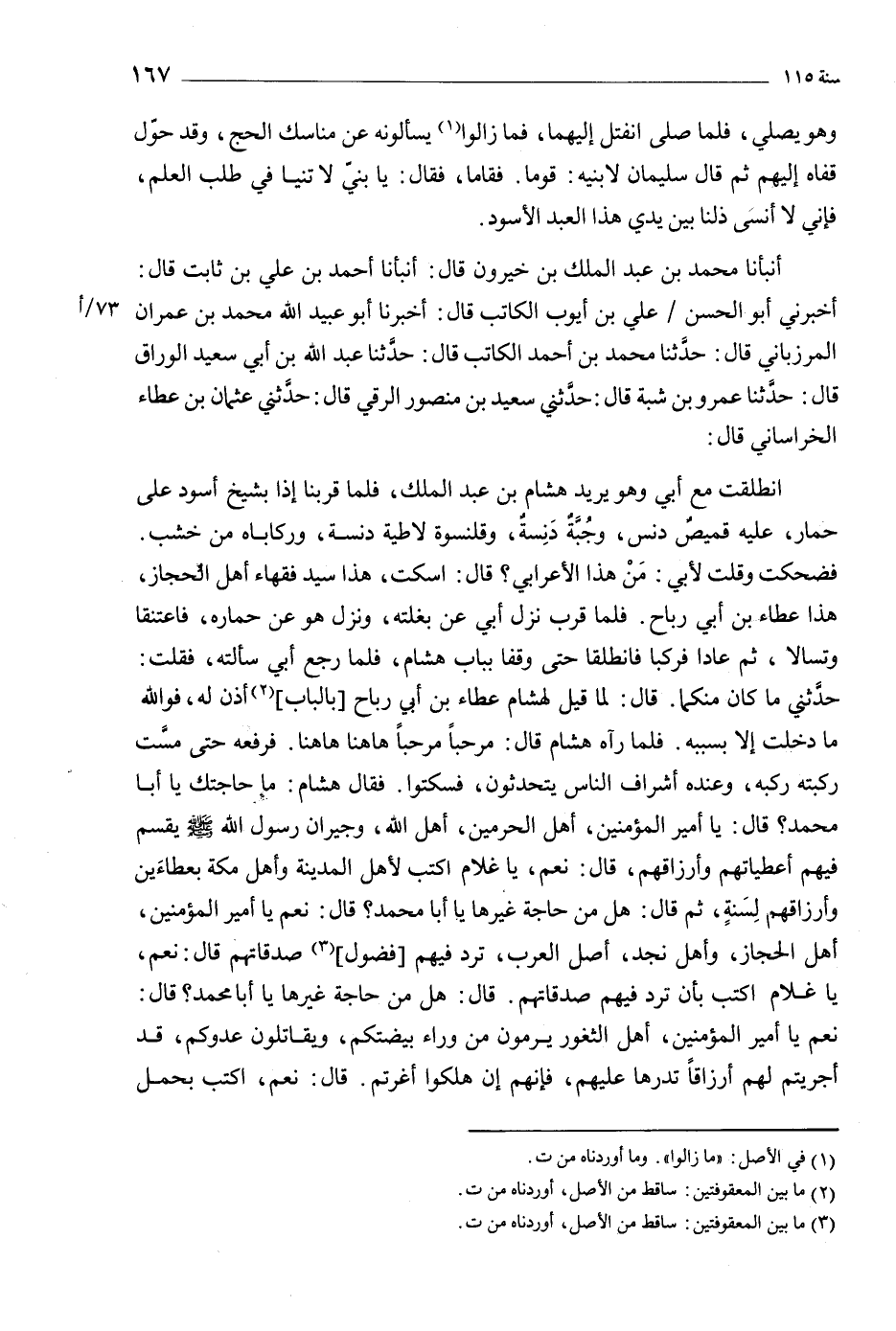 حدثني ما كان منكما. قال: لما قيل لهشام عطاء بن أبي رباح [بالباب] [2] أذن له، فو الله ما دخلت إلا بسببه. فلما رآه هشام قال: مرحبا مرحبا هاهنا هاهنا. فرفعه حتى مست ركبته ركبه، وعنده أشراف الناس يتحدثون، فسكتوا. فقال هشام: ما حاجتك يا أبا محمد؟ قال: يا أمير المؤمنين، أهل الحرمين، أهل الله، وجيران رسول الله صلى الله عليه وسلّم يقسم فيهم أعطياتهم وأرزاقهم، قال: نعم، يا غلام اكتب لأهل المدينة وأهل مكة بعطاءين وأرزاقهم لسنة، ثم قال: هل من حاجة غيرها يا أبا محمد؟ قال: نعم يا أمير المؤمنين، أهل الحجاز، وأهل نجد، أصل العرب، ترد فيهم [فضول] [3] صدقاتهم قال: نعم، يا غلام أكتب بأن ترد فيهم صدقاتهم. قال: هل من حاجة غيرها يا أبا محمد؟ قال: