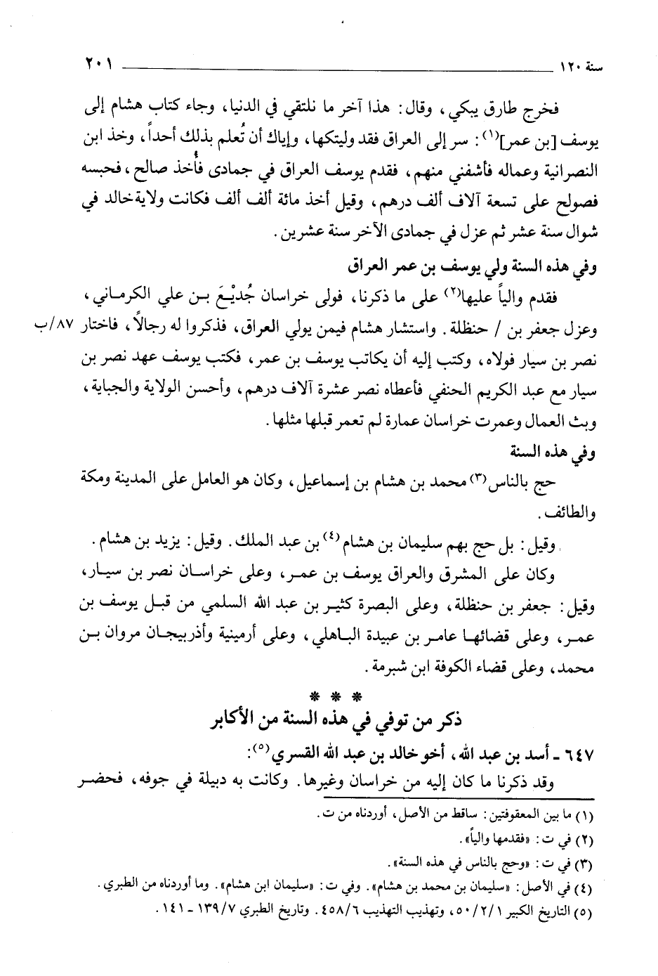 فخرج طارق يبكي، وقال: هذا آخر ما نلتقي في الدنيا، وجاء كتاب هشام إلى يوسف [بن عمر] [1] : سر إلى العراق فقد وليتكها، وإياك أن تعلم بذلك أحدا، وخذ ابن النصرانية وعماله فأشفني منهم، فقدم يوسف العراق في جمادى فأخذ صالح، فحبسه فصولح على تسعة آلاف ألف درهم، وقيل أخذ مائة ألف ألف فكانت ولاية خالد في شوال سنة عشر ثم عزل في جمادى الآخر سنة عشرين.