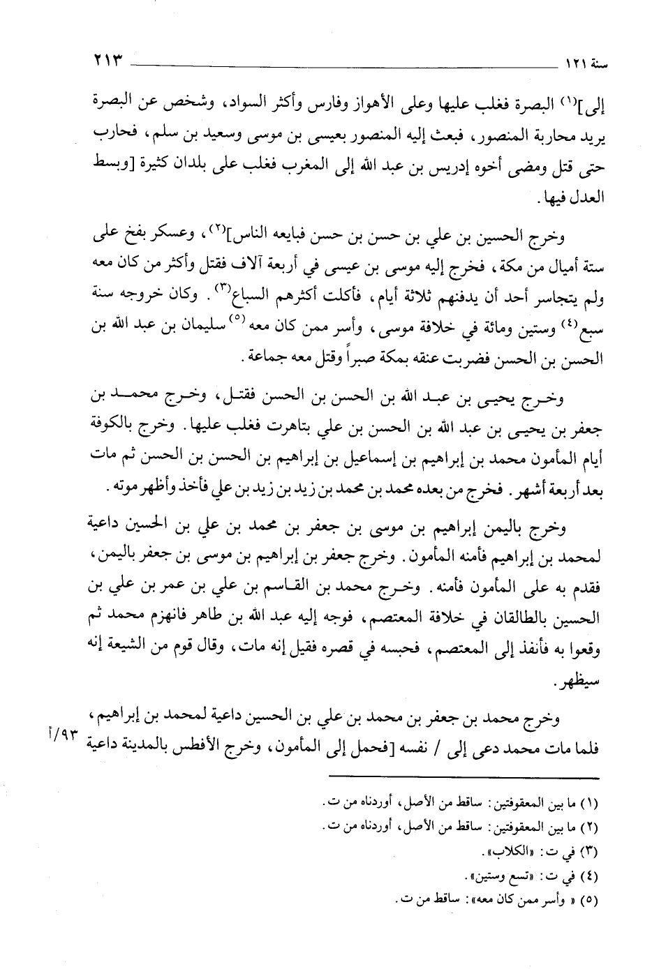 وخرج الحسين بن علي بن حسن بن حسن فبايعه الناس] [2] ، وعسكر بفخ على ستة أميال من مكة، فخرج إليه موسى بن عيسى في أربعة آلاف فقتل وأكثر من كان معه ولم يتجاسر أحد أن يدفنهم ثلاثة أيام، فأكلت أكثرهم السباع [3] . وكان خروجه سنة سبع [4] وستين ومائة في خلافة موسى، وأسر ممن كان معه [5] سليمان بْن عَبْد اللَّه بْن الْحَسَن بْن الْحَسَن فضربت عنقه بمكة صبرا وقتل معه جماعة.