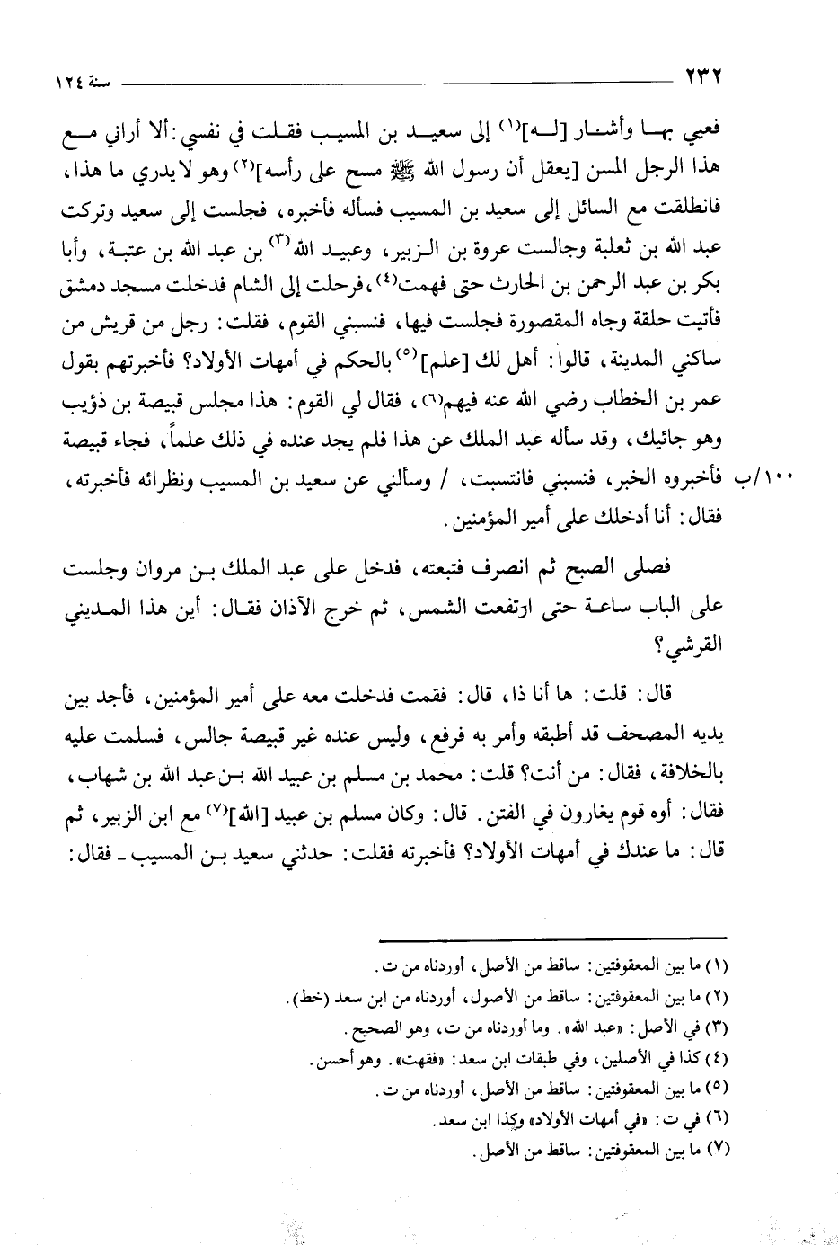 فَعَيِيَ بِهَا وَأَشَارَ [لَهُ] [1] إِلَى سَعِيدِ بْنِ الْمُسَيِّبِ فَقُلْتُ فِي نَفْسِي: أَلا أَرَانِي مَعَ هَذَا الرَّجُلِ الْمُسِنِّ [يَعْقِلُ أَنَّ رَسُولَ اللَّهِ صَلَّى اللَّهُ عَلَيْهِ وَسَلَّمَ مَسَحَ عَلَى رَأْسِهِ] [2] وَهُوَ لا يَدْرِي مَا هَذَا، فَانْطَلَقْتُ مَعَ السَّائِلِ إِلَى سَعِيدِ بْنِ الْمُسَيِّبِ فَسَأَلَهُ فَأَخْبَرَهُ، فَجَلَسْتُ إِلَى سَعِيدٍ وَتَرَكْتُ عَبْدَ اللَّهِ بْنَ ثَعْلَبَةَ وَجَالَسْتُ عُرْوَةَ بْنَ الزُّبَيْرِ، وَعُبَيْدُ اللَّهِ [3] بْنُ عَبْدِ اللَّهِ بْنِ عُتْبَةَ، وَأَبَا بَكْرِ بْنَ عَبْدِ الرَّحْمَنِ بْنِ الْحَارِثِ حَتَّى فَهِمْتُ [4] ، فَرَحَلْتُ إِلَى الشَّامِ فَدَخَلْتُ مَسْجِدَ دِمَشْقَ فَأَتَيْتُ حَلَقَةً وِجَاهَ الْمَقْصُورَةِ فَجَلَسْتُ فِيهَا، فَنَسَبَنِي الْقَوْمُ، فَقُلْتُ: رَجُلٌ مِنْ قُرَيْشٍ مِنْ سَاكِنِي الْمَدِينَةِ، قَالُوا: أَهَلْ لَكَ [عِلْمٌ] [5] بِالْحُكْمِ فِي أُمَّهَاتِ الأَوْلادِ؟ فَأَخْبَرْتُهُمْ بِقَوْلِ عُمَرَ بْنِ الْخَطَّابِ رَضِيَ اللَّهُ عَنْهُ فِيهِمْ [6] ، فَقَالَ لِي الْقَوْمُ: هَذَا مَجْلِسُ قَبِيصَةَ بْنِ ذُؤَيْبٍ وَهُوَ جَائيكَ، وَقَدْ سَأَلَهُ عَبْدُ الْمَلِكِ عَنْ هَذَا فَلَمْ يَجِدْ عِنْدَهُ فِي ذَلِكَ عِلْمًا، فَجَاءَ قَبِيصَةُ فَأَخْبَرُوهُ الْخَبَرَ، فَنَسَبَنِي فَانْتَسَبْتُ، وَسَأَلَنِي عَنْ سَعِيدِ بْنِ الْمُسَيِّبِ وَنُظَرَائِهِ فَأَخْبَرْتُهُ، فَقَالَ: أَنَا أُدْخِلُكَ عَلَى أَمِيرِ الْمُؤْمِنِينَ.