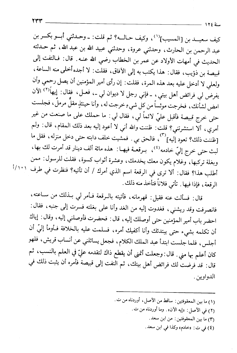 كَيْفَ سَعِيدُ بْنُ [الْمُسَيِّبِ] [1] ، وَكَيْفَ حَالِهِ؟ ثُمَّ قُلْتُ: - وَحَدَّثَنِي أَبُو بَكْرِ بْنُ عَبْدِ الرَّحْمَنِ بْنِ الْحَارِثِ، وَحَدَّثَنِي عُرْوَةُ، وَحَدَّثَنِي عُبَيْدُ اللَّهِ بْنُ عَبْدِ اللَّهِ، ثُمَّ حَدَّثْتُهُ الْحَدِيثَ فِي أُمَّهَاتِ الأَوْلادِ عَنْ عُمَرَ بْنِ الخَطَّابِ رَضِيَ اللَّه عَنْهُ. قَالَ: فَالْتَفَتُّ إِلَى قَبِيصَةَ بْنِ ذُؤَيْبٍ، فَقَالَ: هَذَا يُكْتَبُ بِهِ إِلَى الآفَاقِ، فَقُلْتُ: لا أَجِدُهُ أَخْلَى مِنْهُ السَّاعَةَ، وَلَعَلِّي لا أَدْخُلُ عَلَيْهِ بَعْدَ هَذِهِ الْمَرَّةِ، فَقُلْتُ: إِنْ رَأَى أَمِيرُ الْمُؤْمِنِينَ أَنْ يَصِلَ رَحِمِي وَأَنْ يَفْرِضَ لِي فَرَائِضَ أَهْلِ بَيْتِي، - فَإِنِّي رَجُلٌ لا دِيوَانَ لِي-، فَعَلْ، فَقَالَ: إِيهَا [2] الآنَ امْضِ لِشَأْنِكَ، فَخَرَجْتُ مُوئِسًا مِنْ كُلِّ شَيْءٍ خَرَجْتُ لَهُ، وَأَنَا حِينَئِذٍ مُقِلٌّ مُرْمِلٌ، فَجَلَسْتُ حَتَّى خَرَجَ قَبِيصَةُ فَأَقْبَلَ عَلَيَّ لائِمًا لِي، فَقَالَ لِي: مَا حَمَلَكَ عَلَى مَا صَنَعْتَ مِنْ غَيْرِ أَمْرِي، أَلا اسْتَشَرْتَنِي؟ قُلْتُ: ظَنَنْتُ وَاللَّهِ أَنِّي لا أَعُودُ إِلَيْهِ بَعْدَ ذَلِكَ الْمَقَامِ، قَالَ: وَلِمَ [ظَنَنْتَ ذَلِكَ؟ تَعُودُ إِلَيْهِ] [3] ، فَالْحَقْ بِي. فَمَشَيْتُ خَلْفَ دَابَّتِهِ حَتَّى دَخَلَ مَنْزِلَهُ، فَقَلَّ مَا لَبِثَ حَتَّى خَرَجَ إِلَيَّ خَادِمُهُ [4] ، بِرُقْعَةٍ فِيهَا: هَذِهِ مِائَةُ أَلْفِ دِينَارٍ قَدْ أَمَرْتُ لَكَ بِهَا، وَبَغْلَةٌ تَرْكَبُهَا، وَغُلامٌ يَكُونُ مَعَكَ يَخْدِمُكَ، وَعَشَرَةُ أَثْوَابٍ كِسْوَة، فَقُلْتُ للرَّسُولِ: مِمَّنْ أَطْلُبُ هَذَا؟ فَقَالَ: أَلا تَرَى فِي الرُّقْعَةِ اسْمَ الَّذِي أَمَرَكَ أَنْ تَأْتِيَهُ؟ فَنَظَرْتُ فِي طَرَفِ الرُّقْعَةِ، فَإِذَا فِيهَا. تَأْتِي فُلانًا فَتَأْخُذُ مِنْهُ ذَلِكَ.