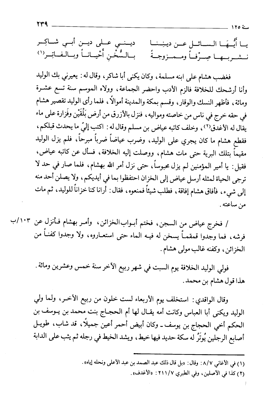 فغضب هشام على ابنه مسلمة، وكان يكنى أبا شاكر، وقال له: يعيرني بك الوليد وأنا أرشحك للخلافة فالزم الأدب واحضر الجماعة، وولاه الموسم سنة تسع عشرة ومائة، فأظهر النسك والوقار، وقسم بمكة والمدينة أموالا، فلما رأى الوليد تقصير هشام في حقه خرج في ناس من خاصته ومواليه، فنزل بالأزرق من أرض بلقين وفزارة على ماء يقال له الأغدق [2] ، وخلف كاتبه عياض بن مسلم وقال له: اكتب إلي ما يحدث قبلكم، فقطع هشام ما كان يجري على الوليد، وضرب عياضا ضربا مبرحا، فلم يزل الوليد مقيما بتلك البرية حتى مات هشام، ووصلت إليه الخلافة، فسأل عن كاتبه عياض، فقيل: يا أمير المؤمنين لم يزل محبوسا، حتى نزل أمر الله بهشام، فلما صار في حد لا ترجى الحياة لمثله أرسل عياض إلى الخزان احتفظوا بما في أيديكم، ولا يصلن أحد منه إلى شيء، فأفاق هشام إفاقة، فطلب شيئا فمنعوه، فقال: أرانا كنا خزانا للوليد، ثم مات من ساعته.