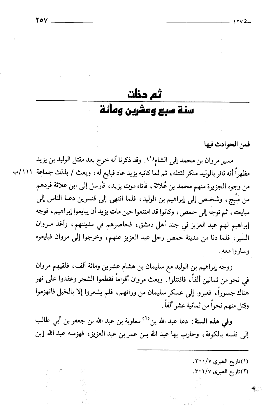 فمن الحوادث فيها مسير مروان بن محمد إلى الشام [1] . وقد ذكرنا أنه خرج بعد مقتل الوليد بن يزيد مظهرا أنه ثائر بالوليد منكر لقتله، ثم لما كاتبه يزيد عاد فبايع له، وبعث بذلك جماعة من وجوه الجزيرة منهم محمد بن علاثة، فأتاه موت يزيد، فأرسل إلى ابن علاثة فردهم من منبج، وشخص إلى إبراهيم بن الوليد، فلما انتهى إلى قنسرين دعا الناس إلى مبايعته، ثم توجه إلى حمص، وكانوا قد امتنعوا حين مات يزيد أن يبايعوا إبراهيم، فوجه إبراهيم لهم عبد العزيز في جند أهل دمشق، فحاصرهم في مدينتهم، وأغذ مروان السير، فلما دنا من مدينة حمص رحل عبد العزيز عنهم، وخرجوا إلى مروان فبايعوه وساروا معه.