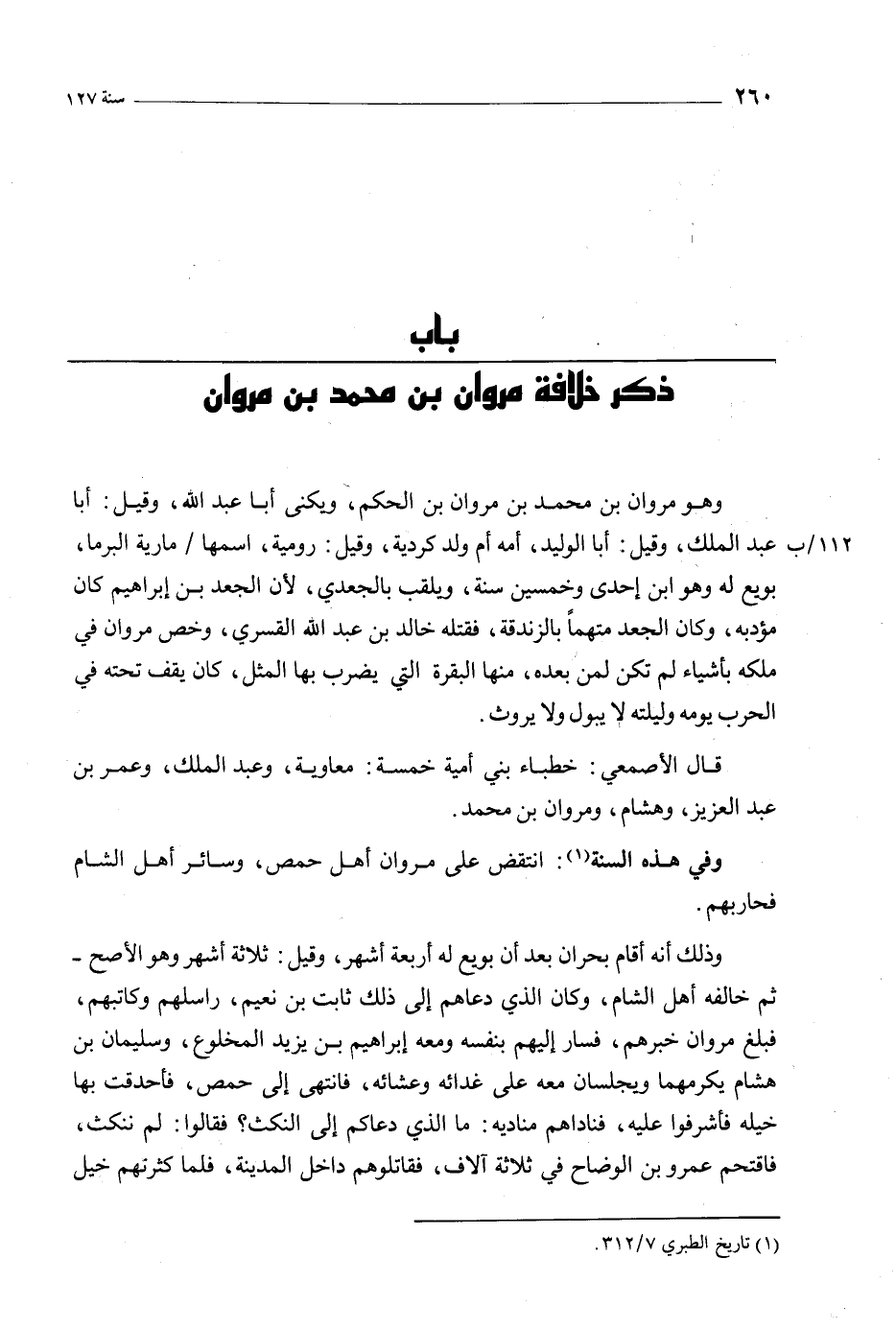 وهو مروان بن محمد بن مروان بن الحكم، ويكنى أبا عبد الله، وقيل: أبا عبد الملك، وقيل: أبا الوليد، أمه أم ولد كردية، وقيل: رومية، اسمها مارية البرما، بويع له وهو ابن إحدى وخمسين سنة، ويلقب بالجعدي، لأن الجعد بن إبراهيم كان مؤدبه، وكان الجعد متهما بالزندقة، فقتله خالد بن عبد الله القسري، وخص مروان في ملكه بأشياء لم تكن لمن بعده، منها البقرة التي يضرب بها المثل، كان يقف تحته في الحرب يومه وليلته لا يبول ولا يروث.