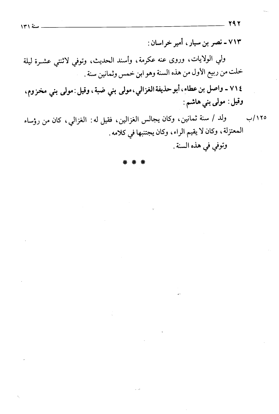 714- واصل بن عطاء، أبو حذيفة الغزالي، مولى بني ضبة، وقيل: مولى بني مخزوم، وقيل: مولي بني هاشم: