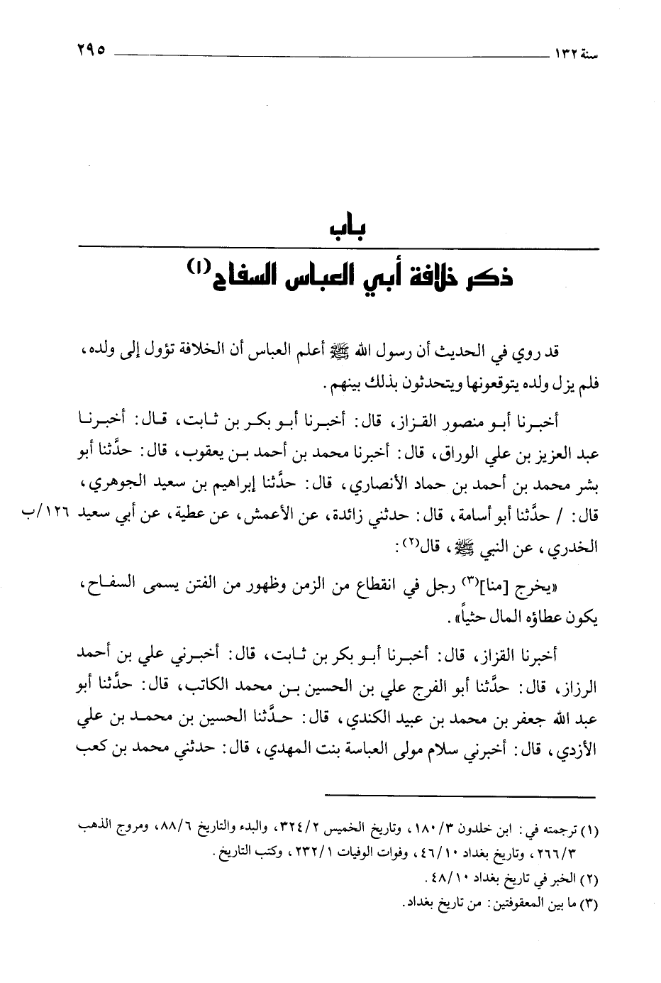 أَخْبَرَنَا أَبُو مَنْصُورٍ الْقَزَّازُ، قَالَ: أخبرنا أبو بكر بن ثابت، قال: أخبرنا عبد العزيز بن علي الوراق، قَالَ: أَخْبَرَنَا مُحَمَّدُ بْنُ أَحْمَدَ بْنِ يَعْقُوبَ، قَالَ: حَدَّثَنَا أبو بشر محمد بن أحمد بن حماد الأَنْصَارِيُّ، قَالَ: حَدَّثَنَا إِبْرَاهِيمُ بْنُ سَعِيدٍ الْجَوْهَرِيُّ، قَالَ: حَدَّثَنَا أَبُو أُسَامَةَ، قَالَ: حَدَّثَنِي زَائِدَةُ، عَنِ الأَعْمَشِ، عَنْ عَطِيَّةَ، عَنْ أَبِي سَعِيدٍ الْخُدْرِيُّ، عَنِ النَّبِيِّ صَلَّى اللَّهُ عَلَيْهِ وَسَلَّمَ، قَالَ [2] : «يَخْرُجُ [مِنَّا] [3] رَجُلٌ فِي انْقِطَاعٍ مِنَ الزَّمَنِ وَظُهُورٍ مِنَ الْفِتَنِ يُسَمَّى السَّفَّاحَ، يَكُونُ عطاؤه المال حثيا» . أَخْبَرَنَا الْقَزَّازُ، قَالَ: أَخْبَرَنَا أَبُو بَكْر بْن ثَابِتٍ، قَالَ: أَخْبَرَنِي عَلِيُّ بْنُ أَحْمَدَ الرَّزَّازُ، قَالَ: حَدَّثَنَا أَبُو الْفَرَجِ عَلِيُّ بْنُ الْحُسَيْنِ بْنِ مُحَمَّدٍ الْكَاتِبُ، قَالَ: حَدَّثَنَا أَبُو عَبْدِ اللَّهِ جَعْفَرُ بْنُ مُحَمَّدِ بْنِ عُبَيْدٍ الْكِنْدِيُّ، قَالَ: حَدَّثَنَا الْحُسَيْنُ بْنُ مُحَمَّدِ بْنِ عَلِيٍّ الأَزْدِيُّ، قَالَ: أَخْبَرَنِي سَلامٌ مَوْلَى الْعَبَّاسَةِ بِنْتِ المهدي، قال: حدثني محمد بن كعب