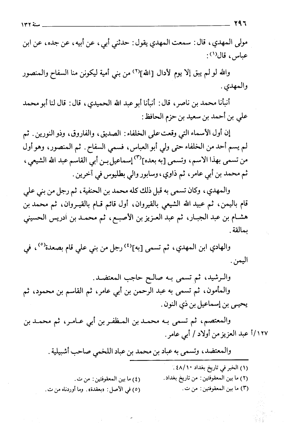 إن أول الأسماء التي وقعت على الخلفاء: الصديق، والفاروق، وذو النورين. ثم لم يسم أحد من الخلفاء حتى ولي أبو العباس، فسمي السفاح. ثم المنصور، وهو أول من تسمى بهذا الاسم، وتسمى [به بعده] [3] إسماعيل بن أبي القاسم عبد الله الشيعي، ثم محمد بن أبي عامر، ثم ذاوي، وسابور والي بطليوس في آخرين.
