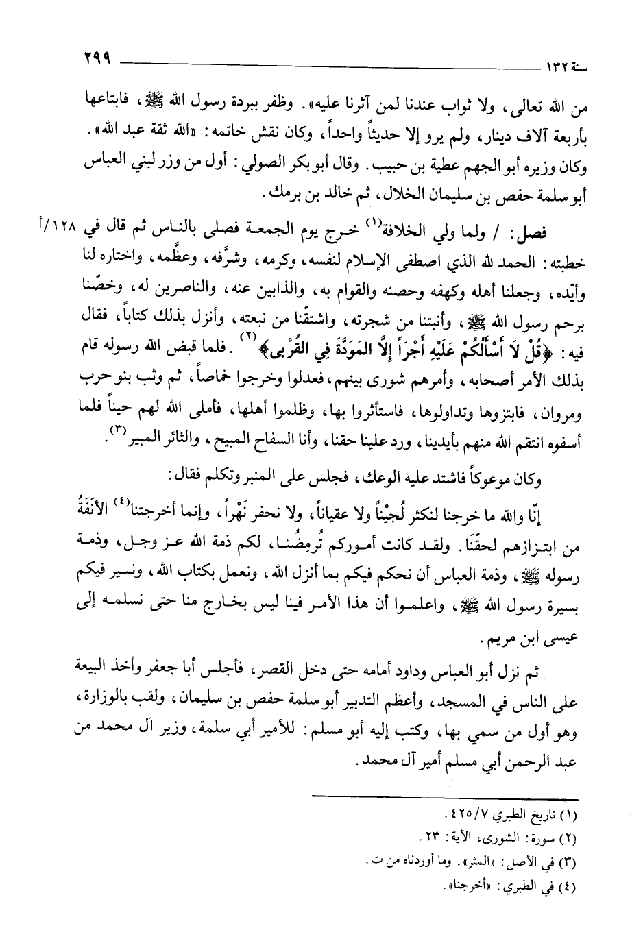 فصل: ولما ولي الخلافة [1] خرج يوم الجمعة فصلى بالناس ثم قال في خطبته: الحمد للَّه الّذي اصطفى الإسلام لنفسه، وكرمه، وشرفه، وعظمه، واختاره لنا وأيّده، وجعلنا أهله وكهفه وحصنه والقوام به، والذابين عنه، والناصرين له، وخصنا برحم رسول الله صلى الله عليه وسلم، وأنبتنا من شجرته، واشتقنا من نبعته، وأنزل بذلك كتابا، فقال فيه: (قُلْ لا أَسْئَلُكُمْ عَلَيْهِ أَجْراً إِلَّا الْمَوَدَّةَ في الْقُرْبى) 42: 23 [2] . فلما قبض الله رسوله قام بذلك الأمر أصحابه، وَأَمْرُهُمْ شُورَى بَيْنَهُمْ، فعدلوا وخرجوا خماصا، ثم وثب بنو حرب ومروان، فابتزوها وتداولوها، فاستأثروا بها، وظلموا أهلها، فأملى الله لهم حينا فلما أسفوه انتقم الله منهم بأيدينا، ورد علينا حقنا، وأنا السفاح المبيح، والثائر المبير [3] .