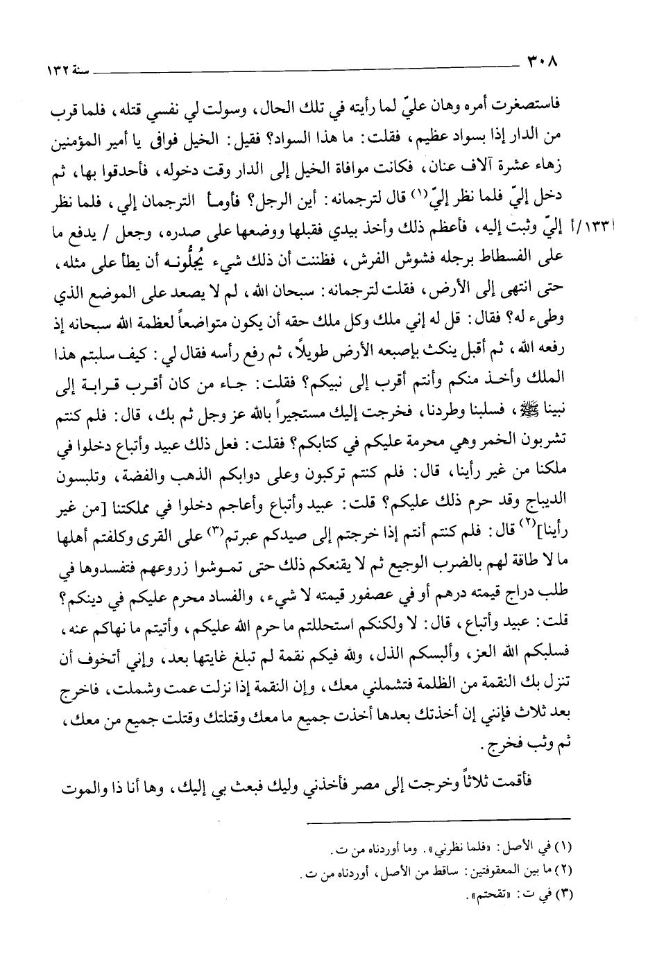 فاستصغرت أمره وهان علي لما رأيته في تلك الحال، وسولت لي نفسي قتله، فلما قرب من الدار إذا بسواد عظيم، فقلت: ما هذا السواد؟ فقيل: الخيل فوافى يا أمير المؤمنين زهاء عشرة آلاف عنان، فكانت موافاة الخيل إلى الدار وقت دخوله، فأحدقوا بها، ثم دخل إلي فلما نظر إلي [1] قال لترجمانه: أين الرجل؟ فأومأ الترجمان إلي، فلما نظر إلي وثبت إليه، فأعظم ذلك وأخذ بيدي فقبلها ووضعها على صدره، وجعل يدفع ما على الفسطاط برجله فشوش الفرش، فظننت أن ذلك شيء يجلونه أن يطأ على مثله، حتى انتهى إلى الأرض، فقلت لترجمانه: سبحان الله، لم لا يصعد على الموضع الذي وطئ له؟ فقال: قل له إني ملك وكل ملك حقه أن يكون متواضعا لعظمة الله سبحانه إذ رفعه الله، ثم أقبل ينكث بإصبعه الأرض طويلا، ثم رفع رأسه فقال لي: كيف سلبتم هذا الملك وأخذ منكم وأنتم أقرب إلى نبيكم؟ فقلت: جاء من كان أقرب قرابة إلى نبينا صلى الله عليه وسلم، فسلبنا وطردنا، فخرجت إليك مستجيرا باللَّه عز وجل ثم بك، قال: فلم كنتم تشربون الخمر وهي محرمة عليكم في كتابكم؟ فقلت: فعل ذلك عبيد وأتباع دخلوا في ملكنا من غير رأينا، قال: فلم كنتم تركبون وعلى دوابكم الذهب والفضة، وتلبسون الديباج وقد حرم ذلك عليكم؟ قلت: عبيد وأتباع وأعاجم دخلوا في مملكتنا [من غير رأينا] [2] قال: فلم كنتم أنتم إذا خرجتم إلى صيدكم عبرتم [3] على القرى وكلفتم أهلها ما لا طاقة لهم بالضرب الوجيع ثم لا يقنعكم ذلك حتى تموشوا زروعهم فتفسدوها في طلب دراج قيمته درهم أو في عصفور قيمته لا شيء، والفساد محرم عليكم في دينكم؟