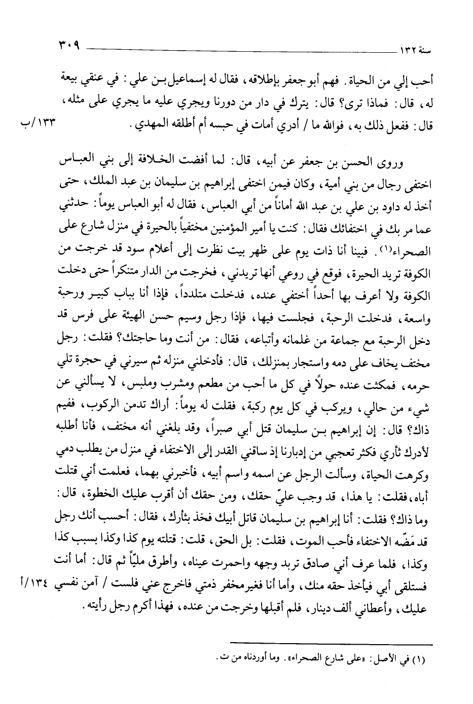 وروى الحسن بن جعفر عن أبيه، قال: لما أفضت الخلافة إلى بني العباس اختفى رجال من بني أمية، وكان فيمن اختفى إبراهيم بن سليمان بن عبد الملك، حتى أخذ له داود بن علي بن عبد الله أمانا من أبي العباس، فقال له أبو العباس يوما: حدثني عما مر بك في اختفائك فقال: كنت يا أمير المؤمنين مختفيا بالحيرة في منزل شارع على الصحراء [1] . فبينا أنا ذات يوم على ظهر بيت نظرت إلى أعلام سود قد خرجت من الكوفة تريد الحيرة، فوقع في روعي أنها تريدني، فخرجت من الدار متنكرا حتى دخلت الكوفة ولا أعرف بها أحدا أختفي عنده، فدخلت متلددا، فإذا أنا بباب كبير ورحبة واسعة، فدخلت الرحبة، فجلست فيها، فإذا رجل وسيم حسن الهيئة على فرس قد دخل الرحبة مع جماعة من غلمانه وأتباعه، فقال: من أنت وما حاجتك؟ فقلت: رجل مختف يخاف على دمه واستجار بمنزلك، قال: فأدخلني منزله ثم سيرني في حجرة تلي حرمه، فمكثت عنده حولا في كل ما أحب من مطعم ومشرب وملبس، لا يسألني عن شيء من حالي، ويركب في كل يوم ركبة، فقلت له يوما: أراك تدمن الركوب، ففيم ذاك؟ قال: إن إبراهيم بن سليمان قتل أبي صبرا، وقد بلغني أنه مختف، فأنا أطلبه لأدرك ثأري فكثر تعجبي من إدبارنا إذ ساقني القدر إلى الاختفاء في منزل من يطلب دمي وكرهت الحياة، وسألت الرجل عن اسمه واسم أبيه، فأخبرني بهما، فعلمت أني قتلت أباه، فقلت: يا هذا، قد وجب علي حقك، ومن حقك أن أقرب عليك الخطوة، قال: