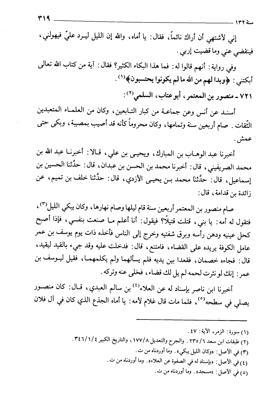 صام منصور بن المعتمر أربعين سنة قام ليلها وصام نهارها، وكان يبكي الليل [3] ، فتقول له أمه: يا بني، قتلت قتيلا؟ فيقول: أنا أعلم ما صنعت بنفسي، فإذا أصبح كحل عينيه ودهن رأسه وبرق شفتيه وخرج إلى الناس فأخذه ذات يوم يوسف بن عمر عامل الكوفة يريده على القضاء، فامتنع، قال: فدخلت عليه وقد جيء بالقيد ليقيد، قال: فجاءه خصمان، فقعدا بين يديه فلم يسألهما ولم يكلمهما، فقيل ليوسف بن عمر: إنك لو نثرت لحمه لم يل لك قضاء، فخلى عنه وتركه.